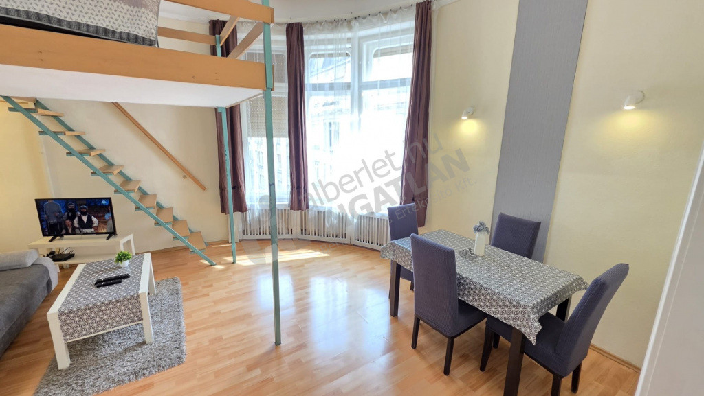 Cicával is Kiadó egy igazán jól kihasznált, 45 nm-es, 2 szobás + galériás, világos lakás a belváros szívében, a Pilvax közre néző, III. emeleti elhelyezkedéssel.