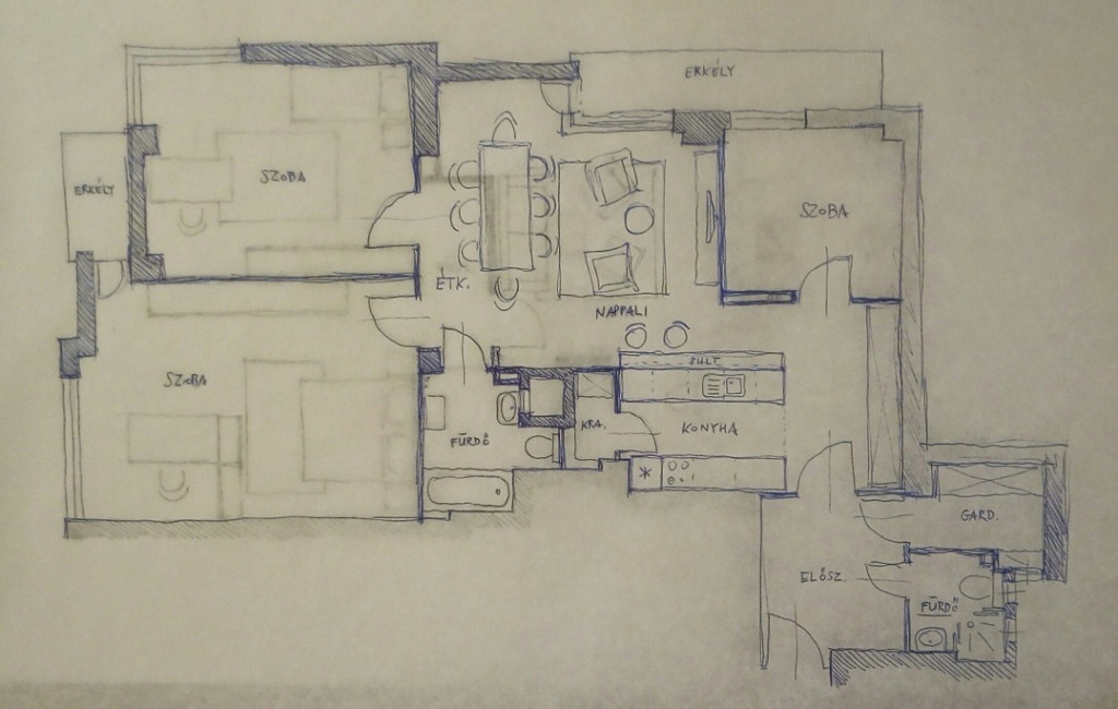 A lakás tágas és praktikus elosztású: 3 háló + fél szoba, 2 ERKÉLY, konyha, kamra, 2 FÜRDŐ (zuhanyzó + kád), gardrób, előszoba.