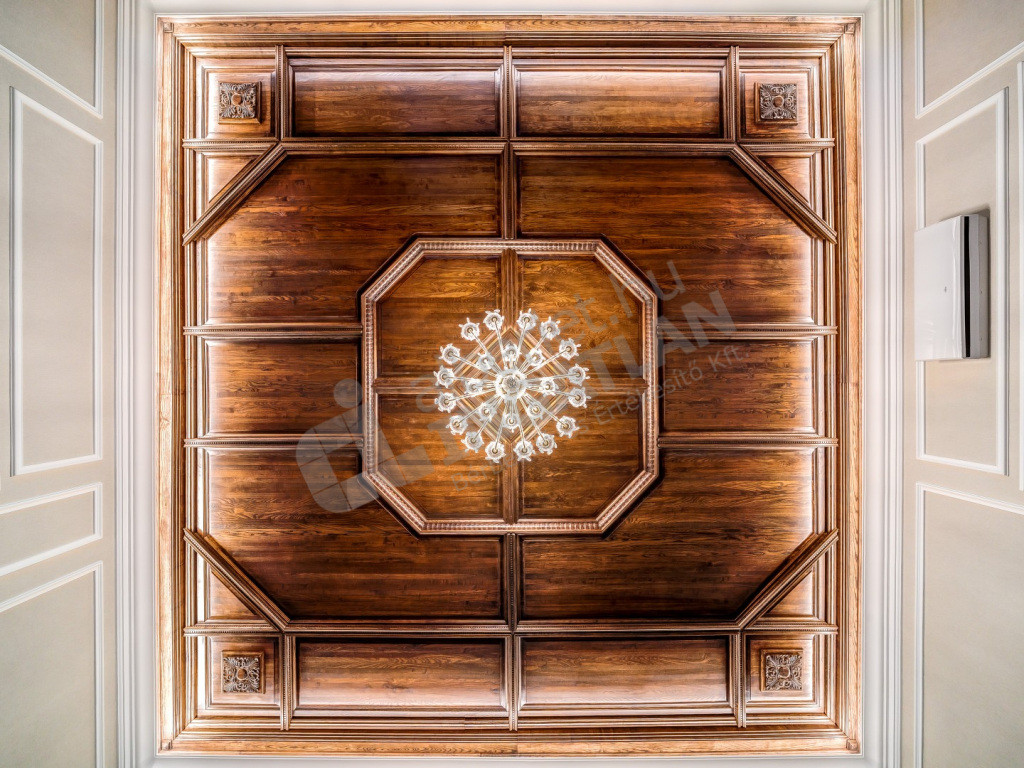 Az otthon egyik leglátványosabb eleme a nappaliban található, egyedileg tervezett és gyártott, pácolt tömör kőrisfa mennyezet. A lakás teljes bútorzata egyedi tervezésű, aprólékos kézimunkával készült. A nappaliból nyíló hálószobák beépített gardróbszekrényei jelentős tárolókapacitást kínálnak.