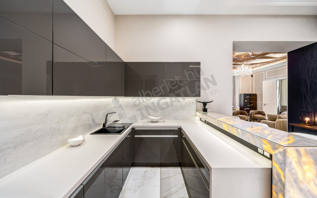 A konyha teljes körűen gépesített (Gorenje, Electrolux és Zanussi készülékekkel), a konyhabútor szintén egyedi tervek alapján készült. A konyhaszigetet lezáró, hideg- és melegfénnyel megvilágított márvány bárpult különleges hangsúlyt ad a térnek.