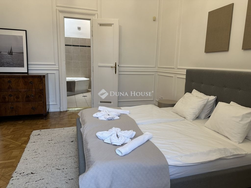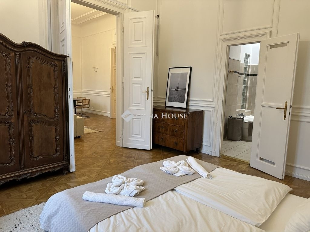 Kiadó az Andrássy út egyik patinás, nagypolgári épületének 2. emeletén egy igényesen felújított, 128 négyzetméteres, nappali + két hálószobás lakás.