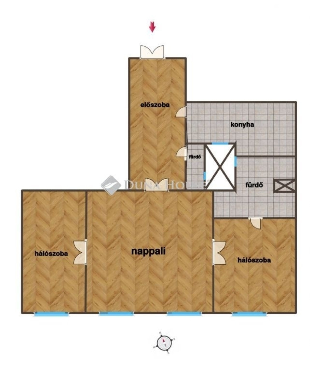 A lakáshoz nagy, tágas előszoba tartozik, amely kényelmes közlekedést biztosít a helyiségek között. A fő fürdőszoba kényelmes méretű, emellett külön WC is rendelkezésre áll, amely zuhanyzóval felszerelt, így a lakás akár több fő számára is komfortosan használható.