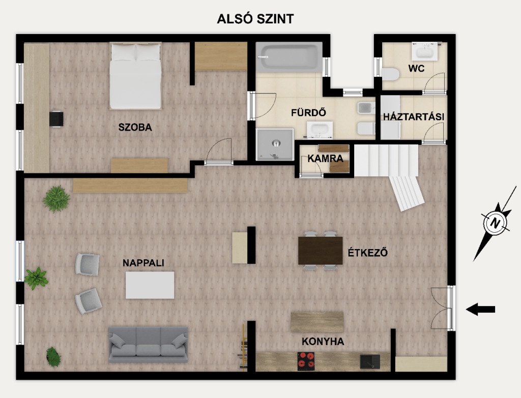 200 nm, 5 szoba, 2 fürdőszoba, amerikaikonyhás nappali.
