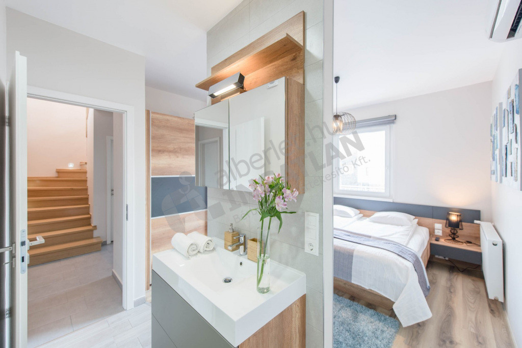 Az alsó szinten található három hálószoba. (TV és klíma minden szobában). Egy szobához terasz is kapcsolódik. Az alsó szinten található még a mosókonyha, fürdő, wc.