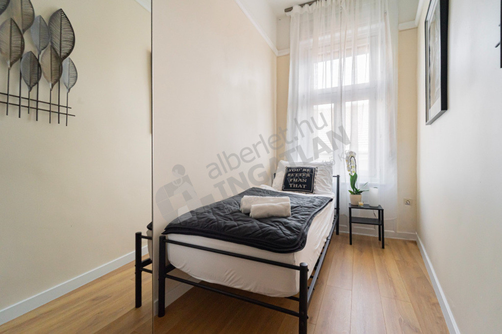 A kiadó ingatlan tavaly került minőségi felújításra a tulajdonos által, egy nagyméretű lakás lett felosztva 3 kisebb lakásra, a lakások közös előtérből nyílnak, melyből jelen lakás 60m2-es, teljesen bútorozott, berendezés rendkívül ízléses, igényes, gépesítés szempontjából teljesen felszerelt, beleértve a mosogatógépet is.