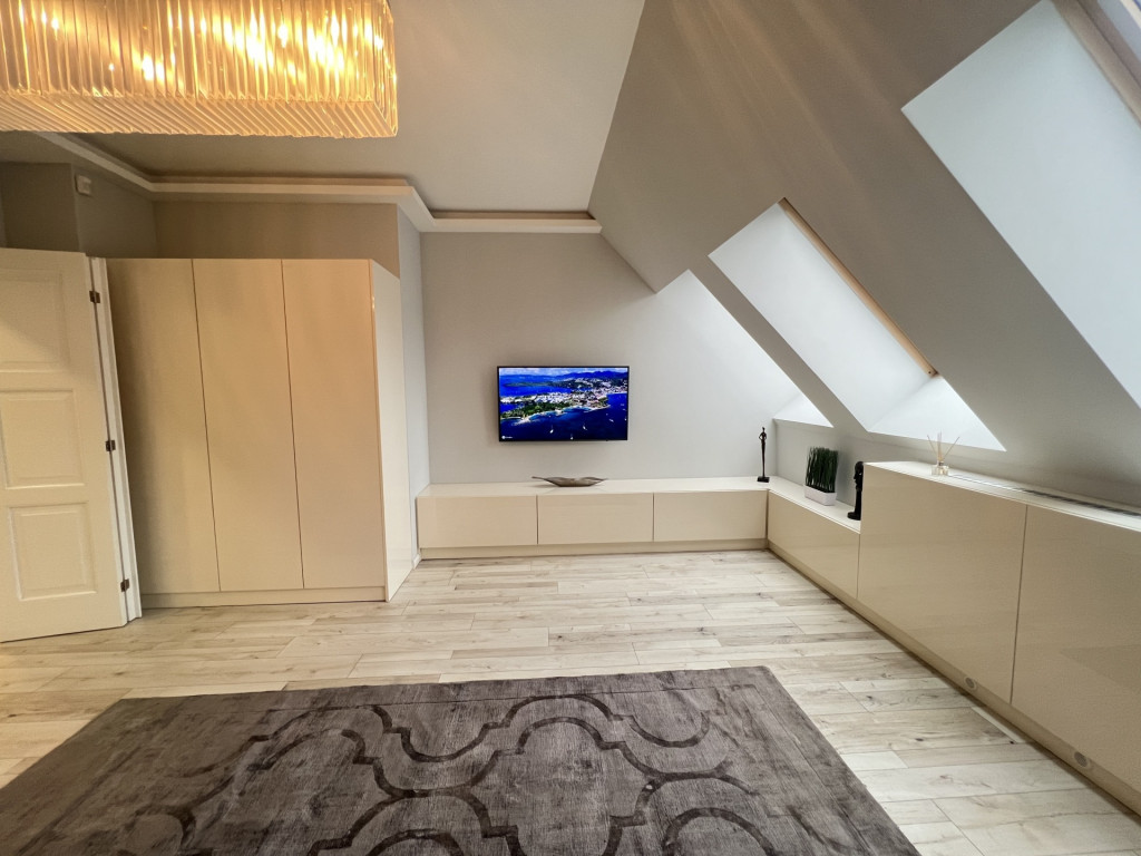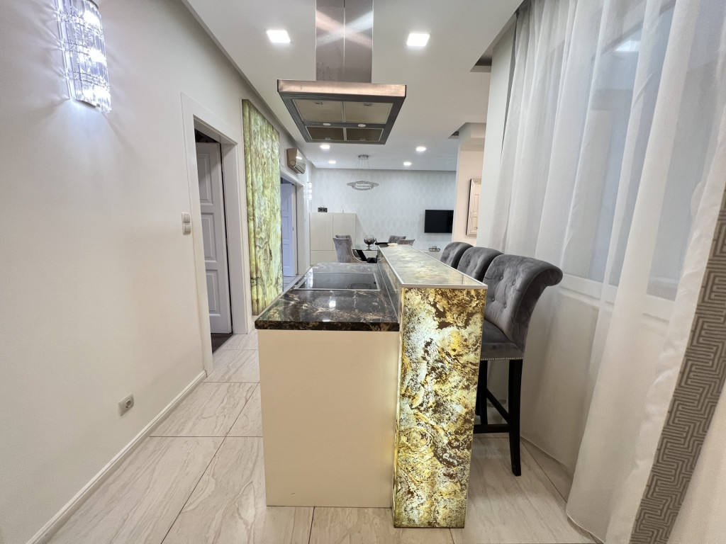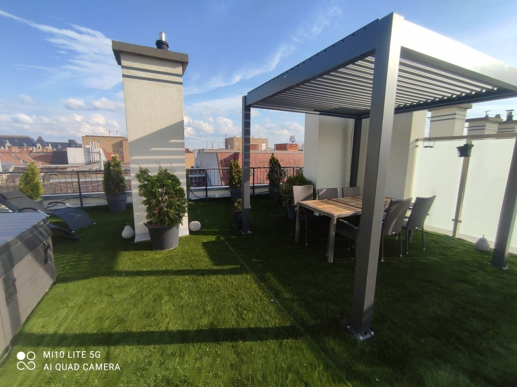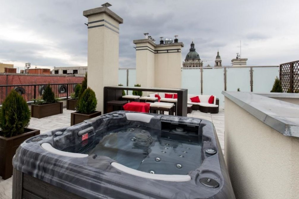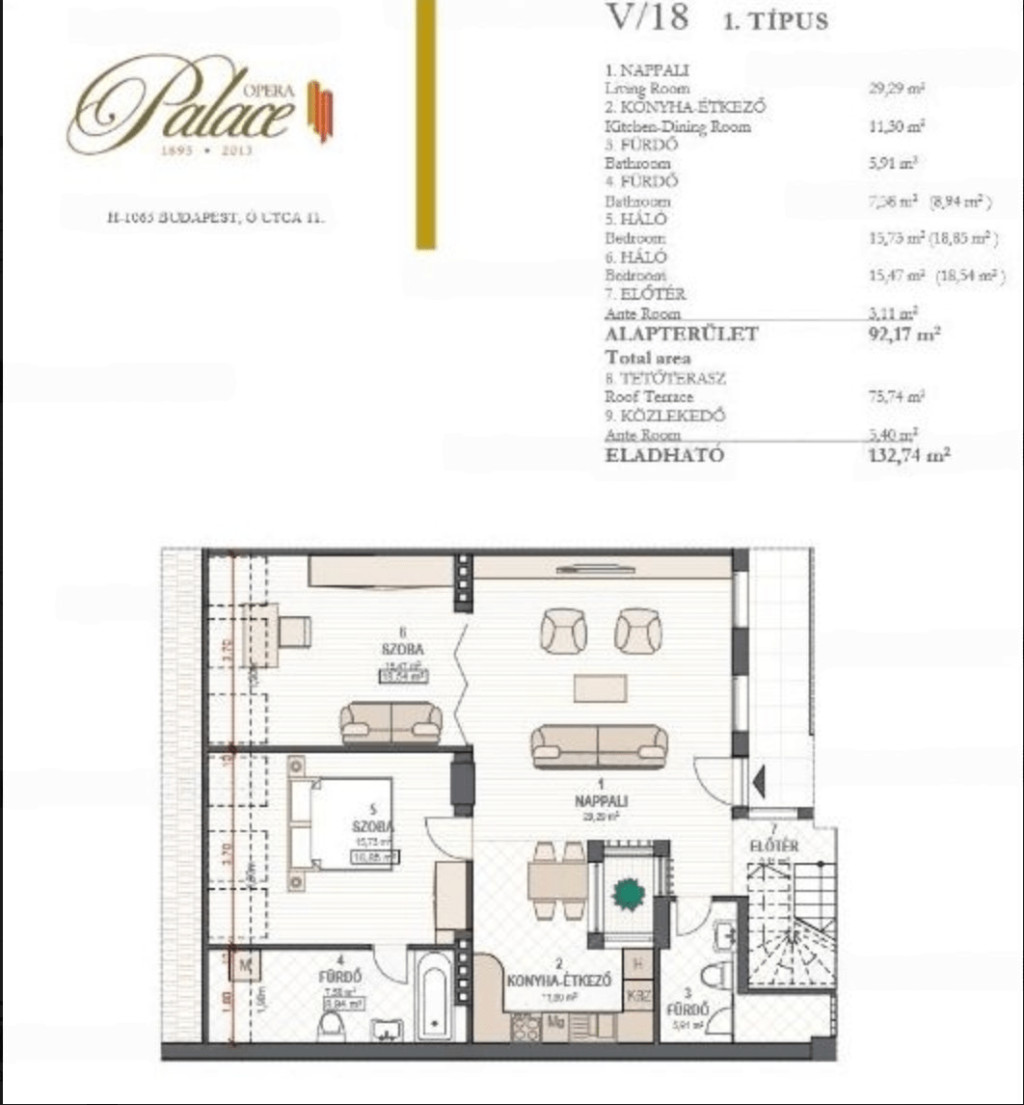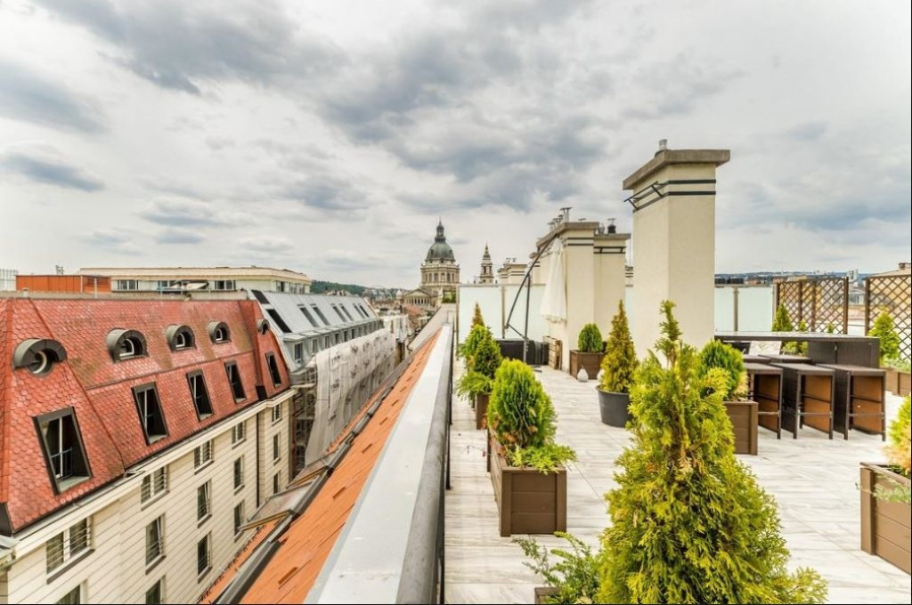 A lakótér 95m2 , részben szeparált amerikai konyhás nappali + 2 HÁLÓSZOBA, + 2 FÜRDŐSZOBA és a hozzátartozó 75 m2-es PRIVÁT JAKUZZIS TETŐTERASZ páratlan PANORÁMÁVAL az OPERÁRA, BAZILIKÁRA, CITADELLÁRA.
