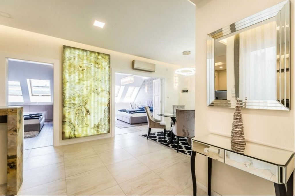 Az egyedi gyártásban készült minőségi bútorok, AEG konyhai és fürdőszobai gépek, kristály csillárok, illetve a különleges világító palafal alkotás ami kellemes hangulatot, nyugalmat áraszt.