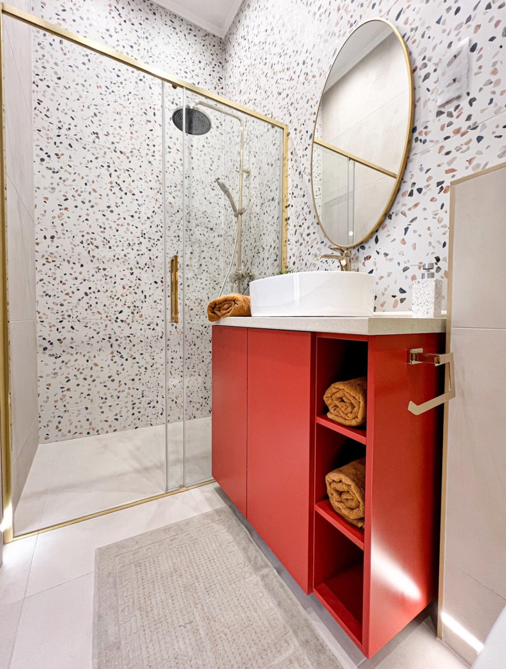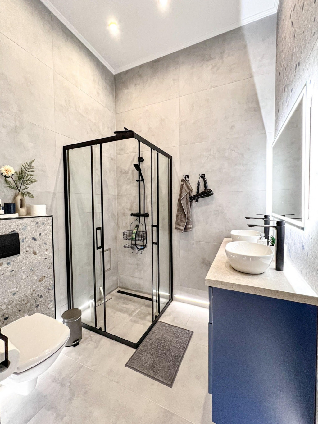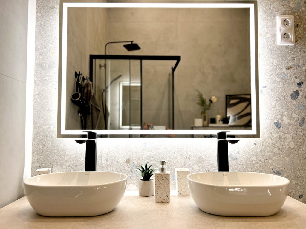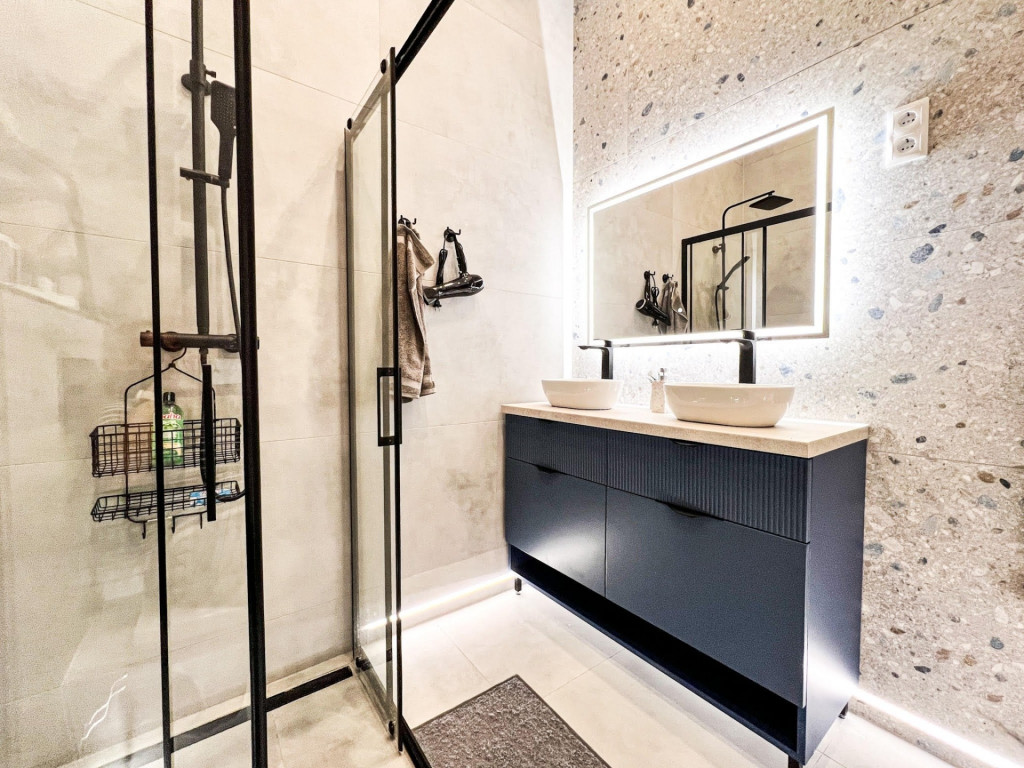 Az épületben 3 hálószoba, amerikai konyhás nappali, 2 fürdő, külön Wc helyiségben.