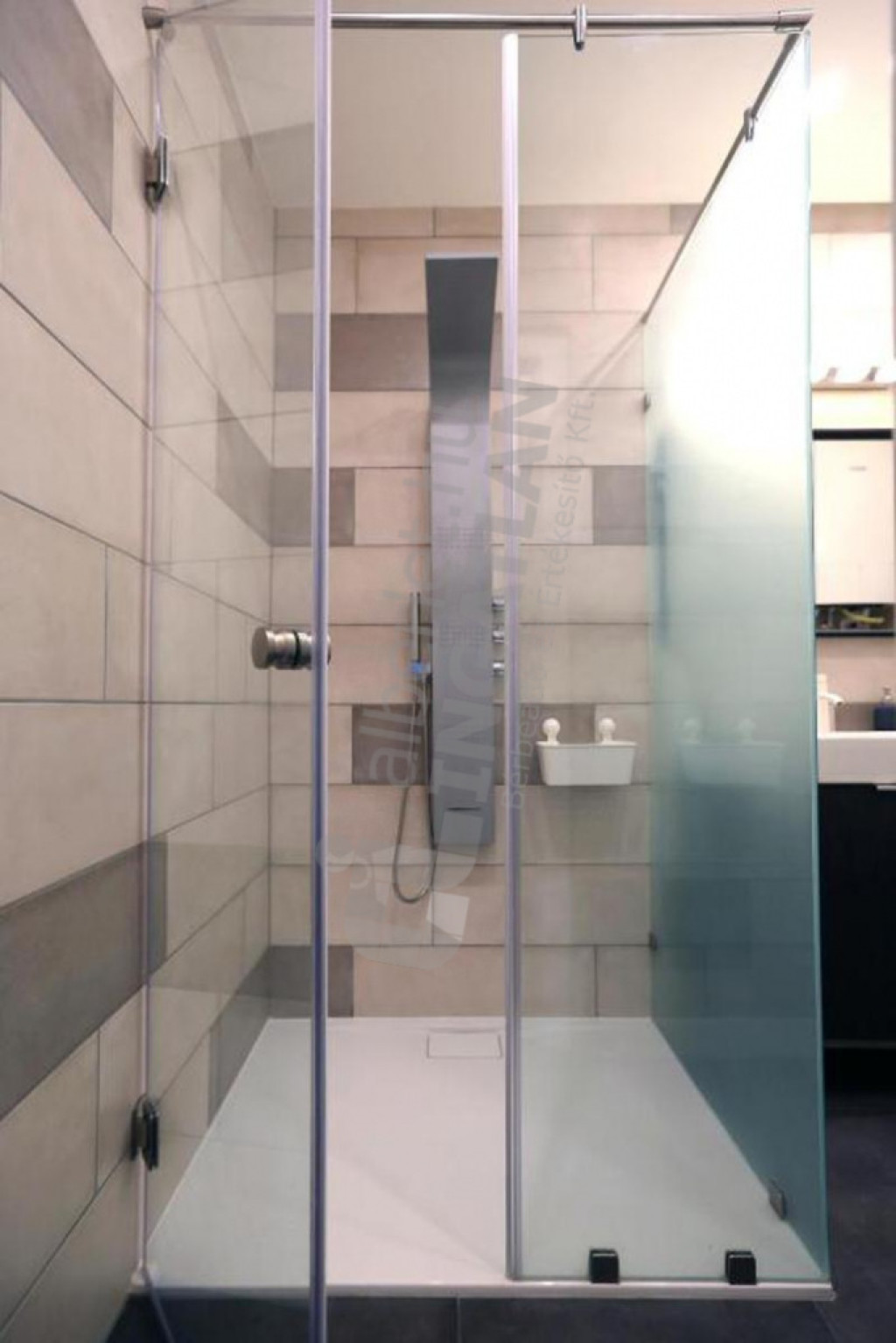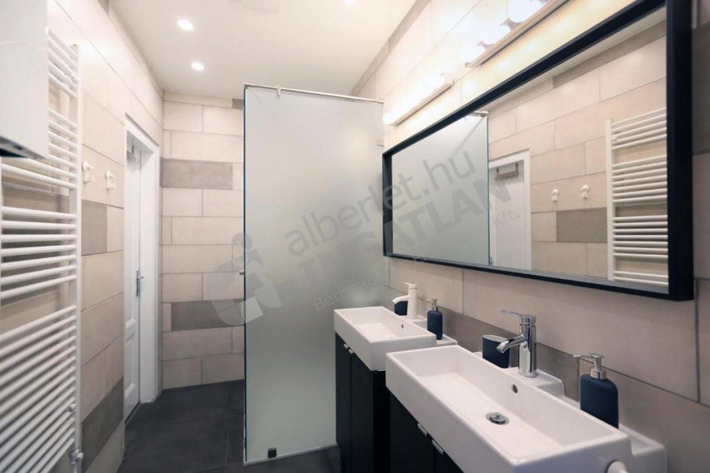 A fürdőszoba tágas, két mosdó és egy zuhanyzó található benne, külön WC.