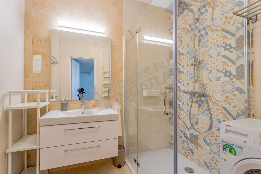 A konyha teljesen gépesített, a lakás klímával, mosógéppel és TV-vel felszerelt.