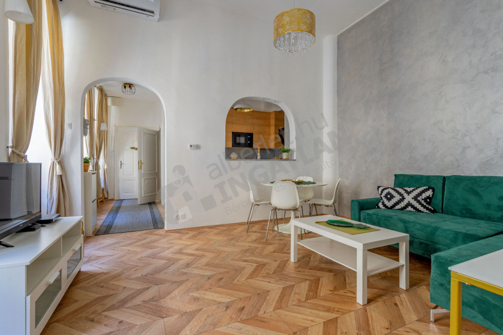 Kiadó egy igényesen felújított, teljesen berendezett, csendes lakás Budapest belvárosában, kiváló közlekedési lehetőségekkel (busz, metró, villamos).