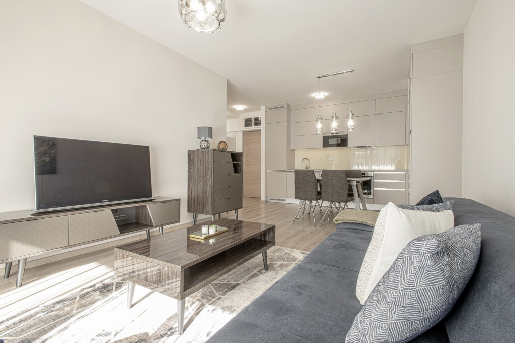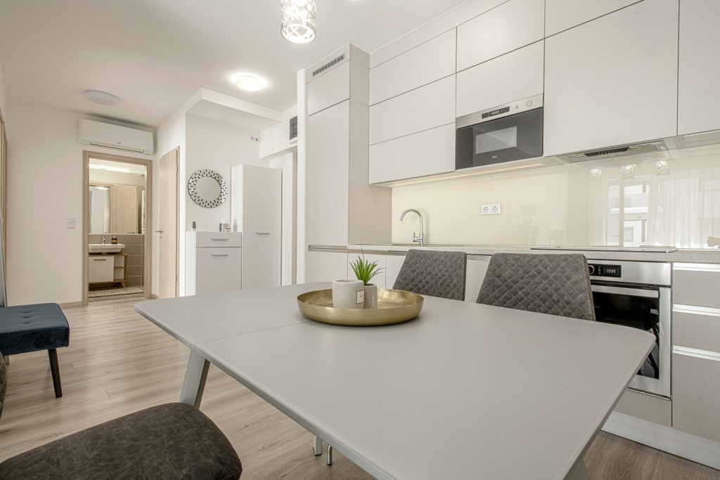 A lakás TELJESEN BÚTOROZOTT, OKOSOTTHON rendszerrel felszerelt, ELEKTROMOS redőnyökkel, modern gépekkel (mosógép, mosogatógép, hűtő, sütő, főzőlap, mikro, Sony TV). A TÁGAS terasz a CSENDES BELSŐ KERTRE néz.