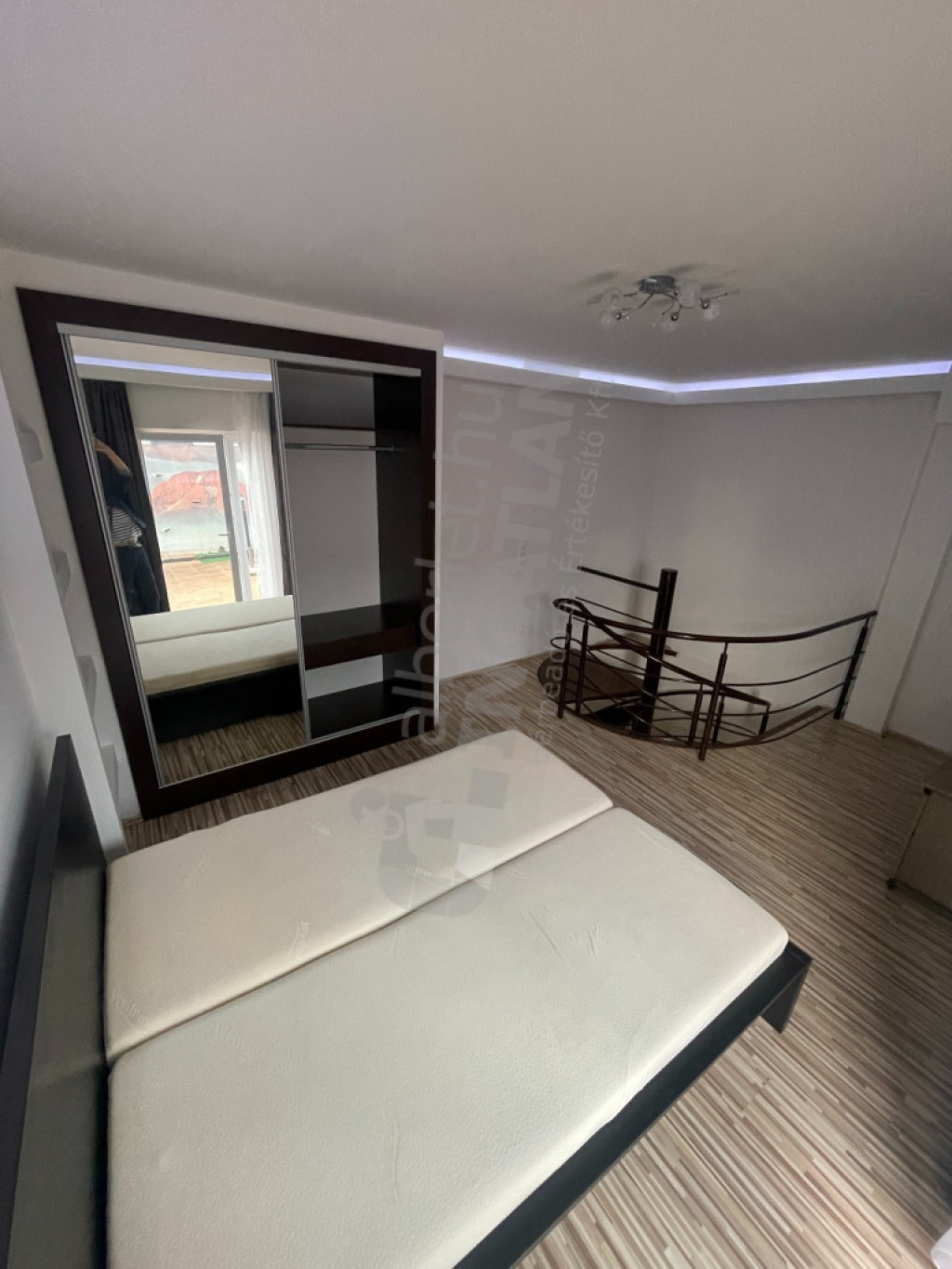 Kényelmes új franciaággyal, nagy tükrös ruhásszekrénnyel felszerelt ez a szint.