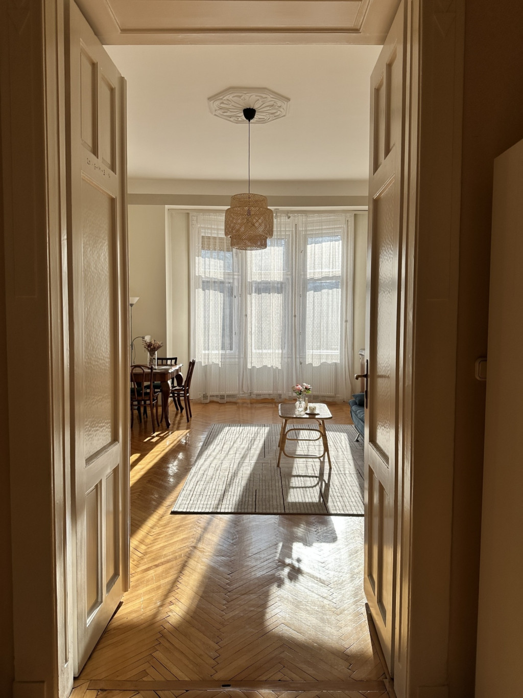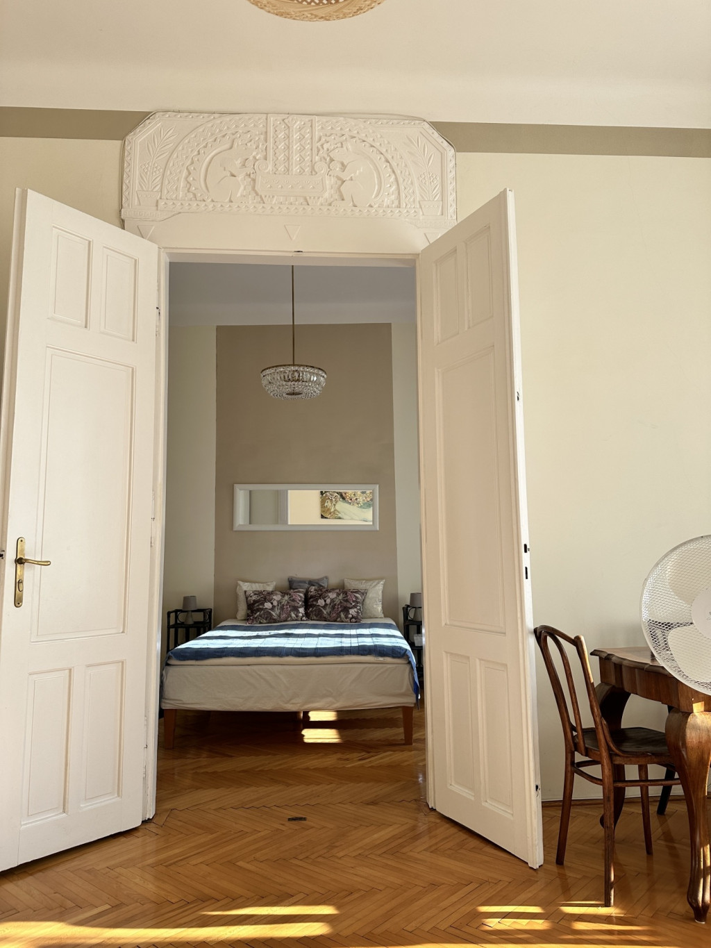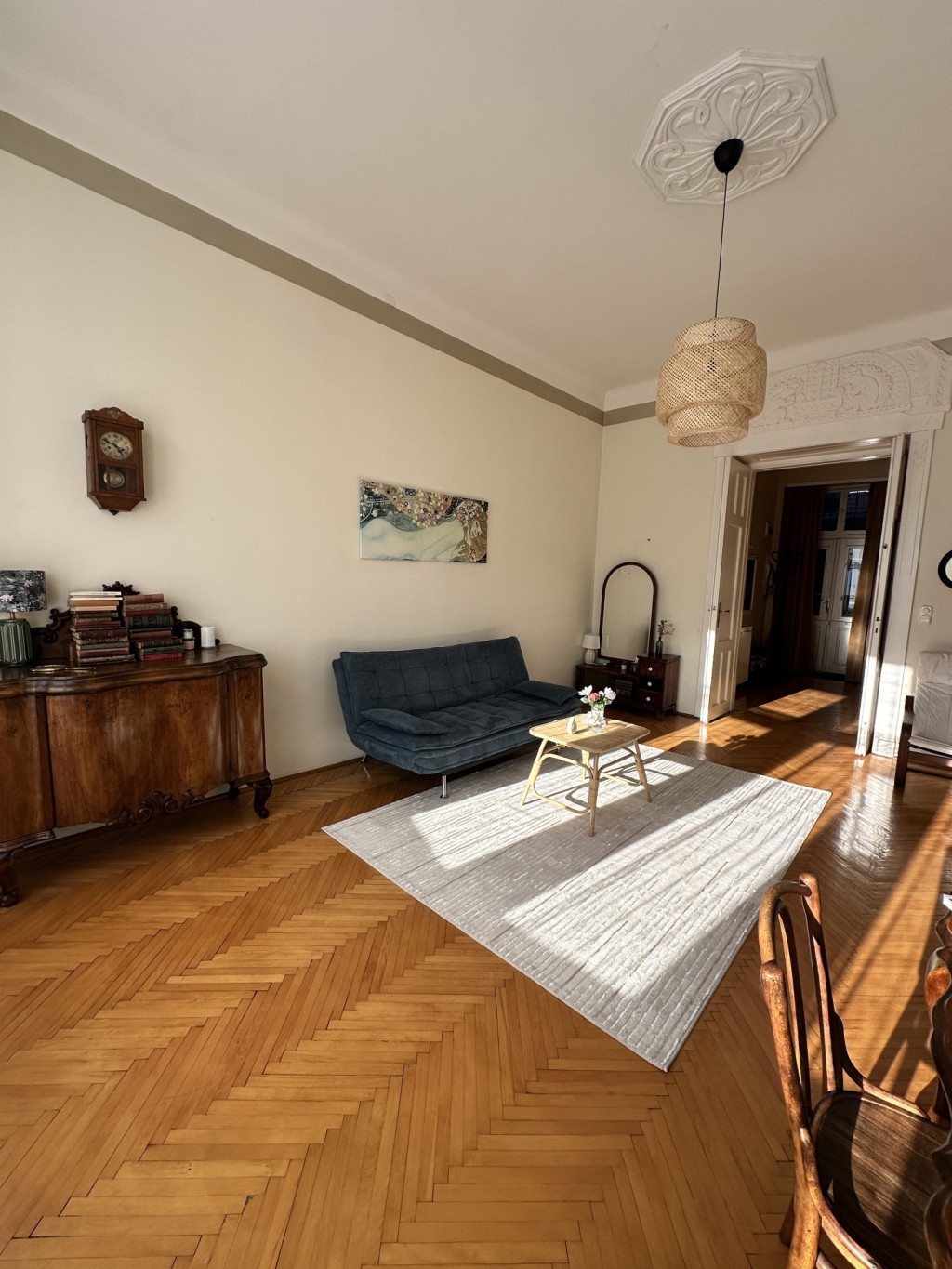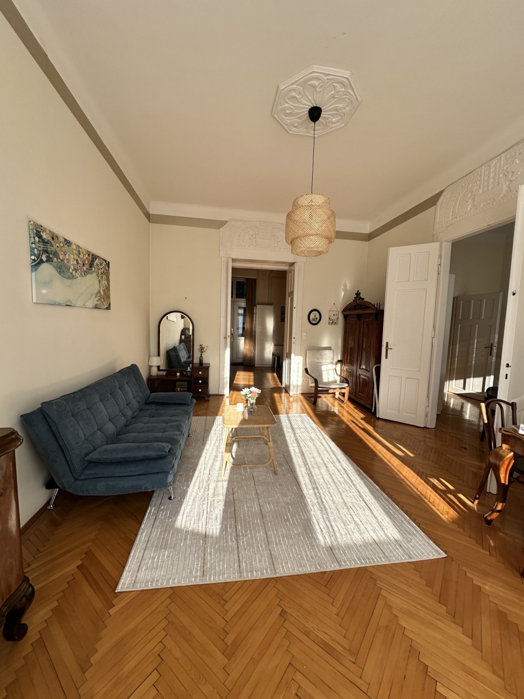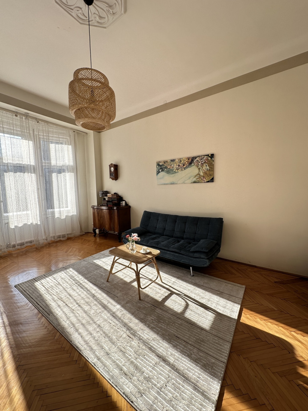 A beautiful, sunny, high-ceiling, 70 sqm, 2-room elegant furnished apartment with balcony is available for rent in Budapest’s District VI, on Vörösmarty Street.
