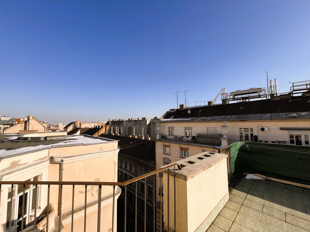 A lakás különlegessége a 28 m²-es saját terasz, amely ritkaságnak számít a belvárosban.