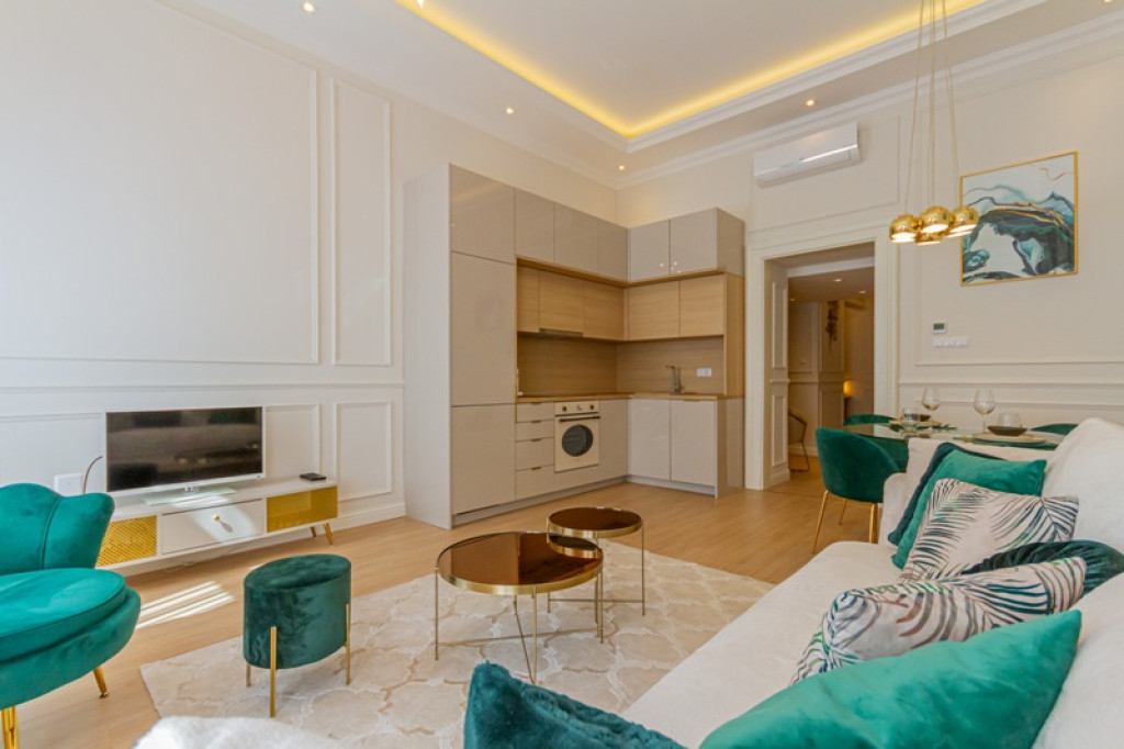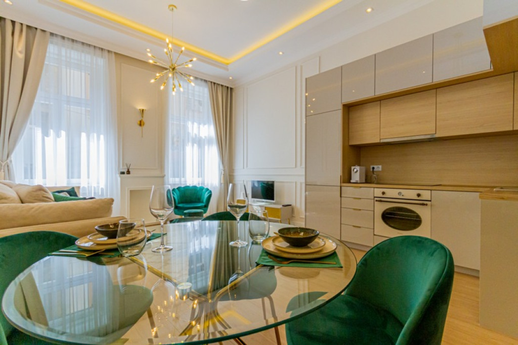 Kiadásra kínáljuk VII. kerületi Dob utcában egy gyönyörűen felújított, teljesen bútorozott luxuslakást,rendezett ház első 1. emeletén.