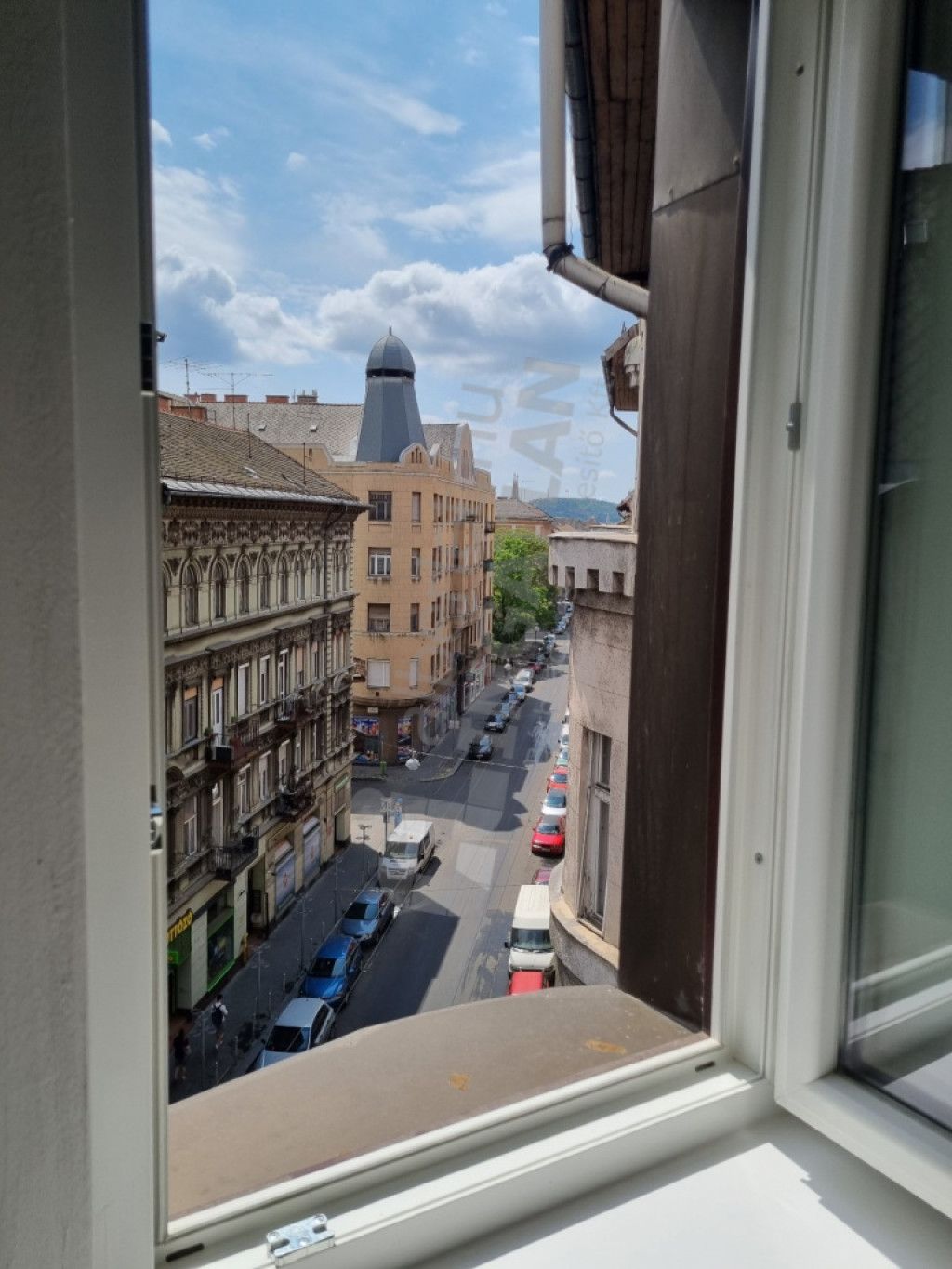Negyedik emeleti, világos, utcára néző ablakok, liftes épületben.