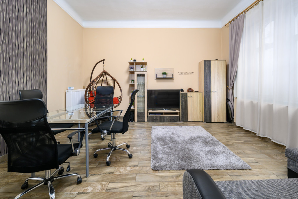 · Világos nappali kihúzható kanapéval, étkezővel, függő fotellel és dolgozósarokkal (íróasztal + irodai szék)
