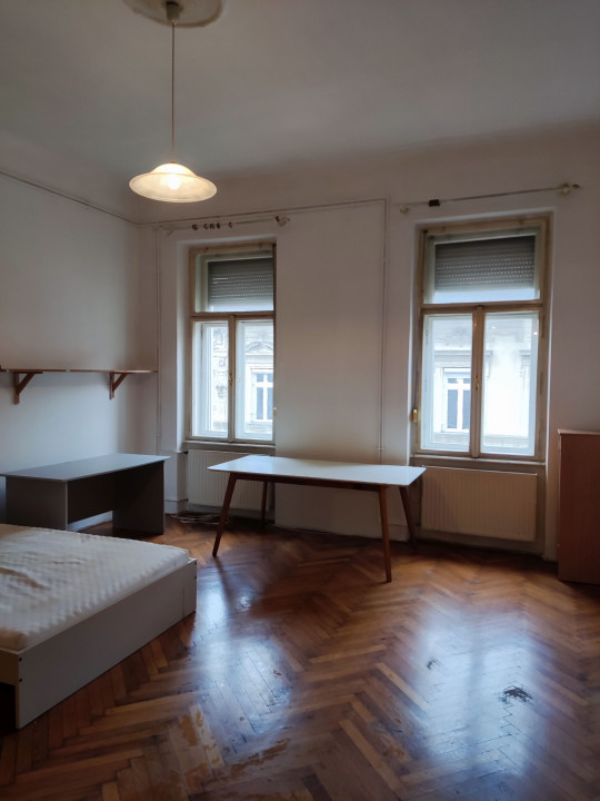 Szoba: parkettás, nagyméretű. Ablakok az utcára néznek. Ablakokon zajszigetelős redőny. Mivel harmadik emelet szinte mindig besüt a nap. (franciaágy, szekrények, étkező és íróasztal)