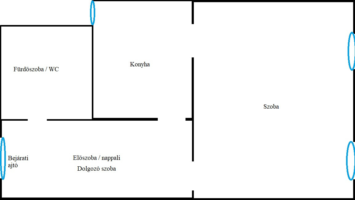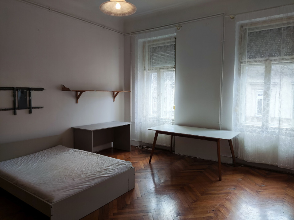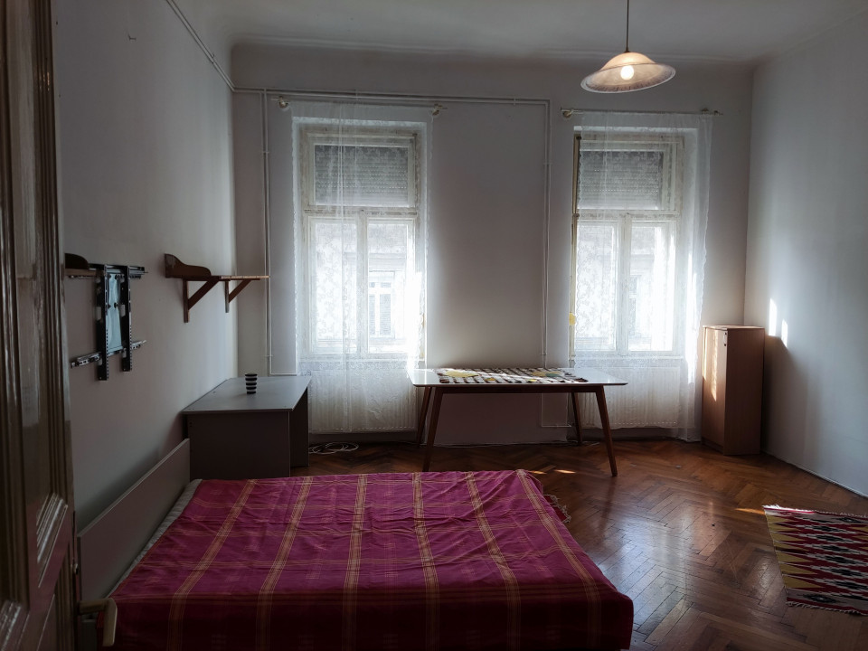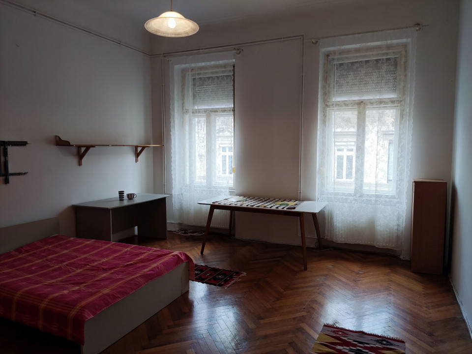 Szoba: parkettás, nagyméretű. Ablakok az utcára néznek. Ablakokon zajszigetelős redőny. Mivel harmadik emelet szinte mindig besüt a nap. (franciaágy, szekrények, étkező és íróasztal)