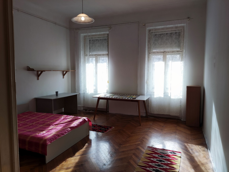 Szoba: parkettás, nagyméretű. Ablakok az utcára néznek. Ablakokon zajszigetelős redőny. Mivel harmadik emelet szinte mindig besüt a nap. (franciaágy, szekrények, étkező és íróasztal)