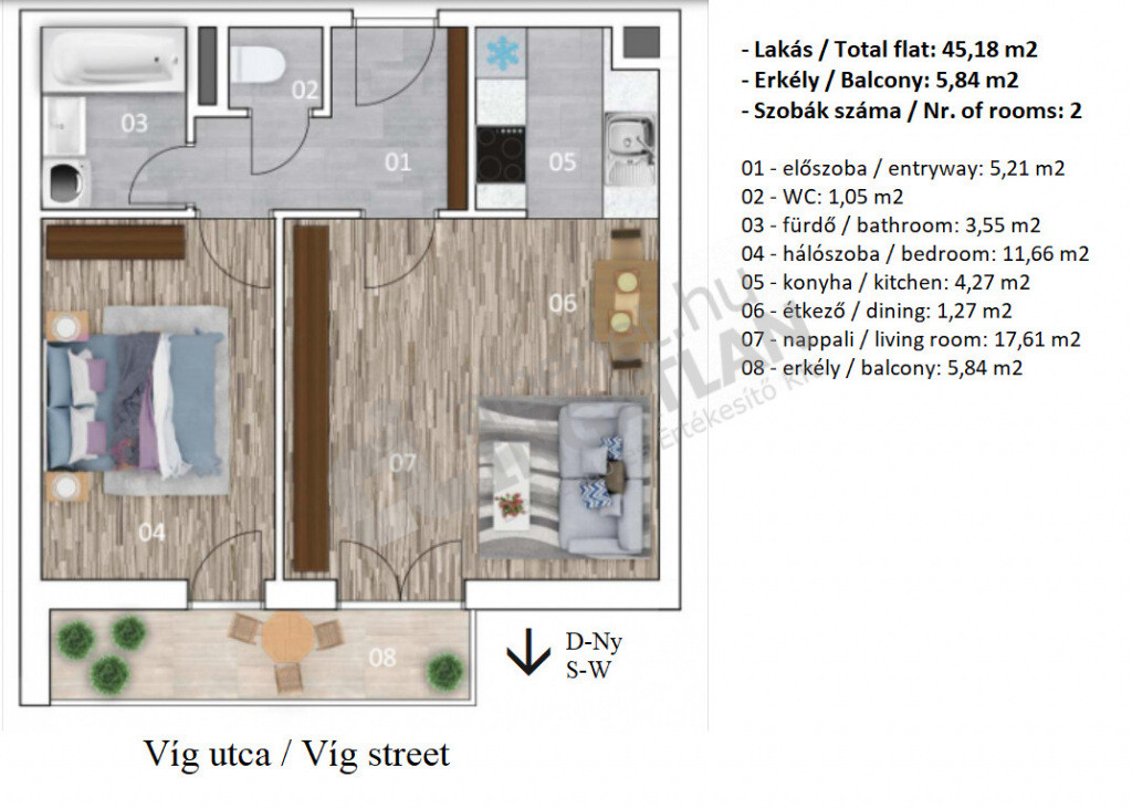 45 nm lakótér + 6 nm erkély, csendes mellékutcára néz (Víg utca irányába), napfényes dél–nyugati fekvés