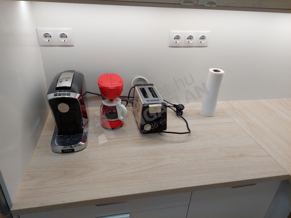 teljes körű gépesítés: elektromos főzőlap és sütő, elszívó, hűtő, mosogatógép, mikró, kávéfőző, kenyérpirító, mosógép, porszívó