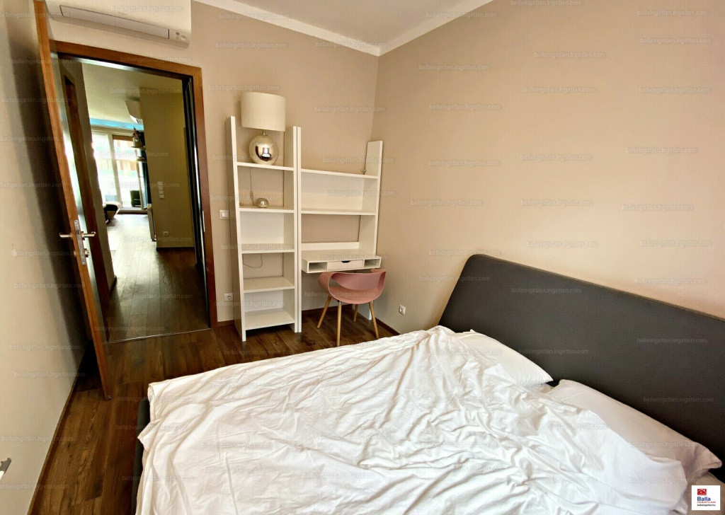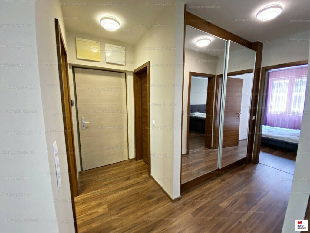 A lakás 2 hálószobás, a folyosón igényes beépített bútorok segítik a tárolást.