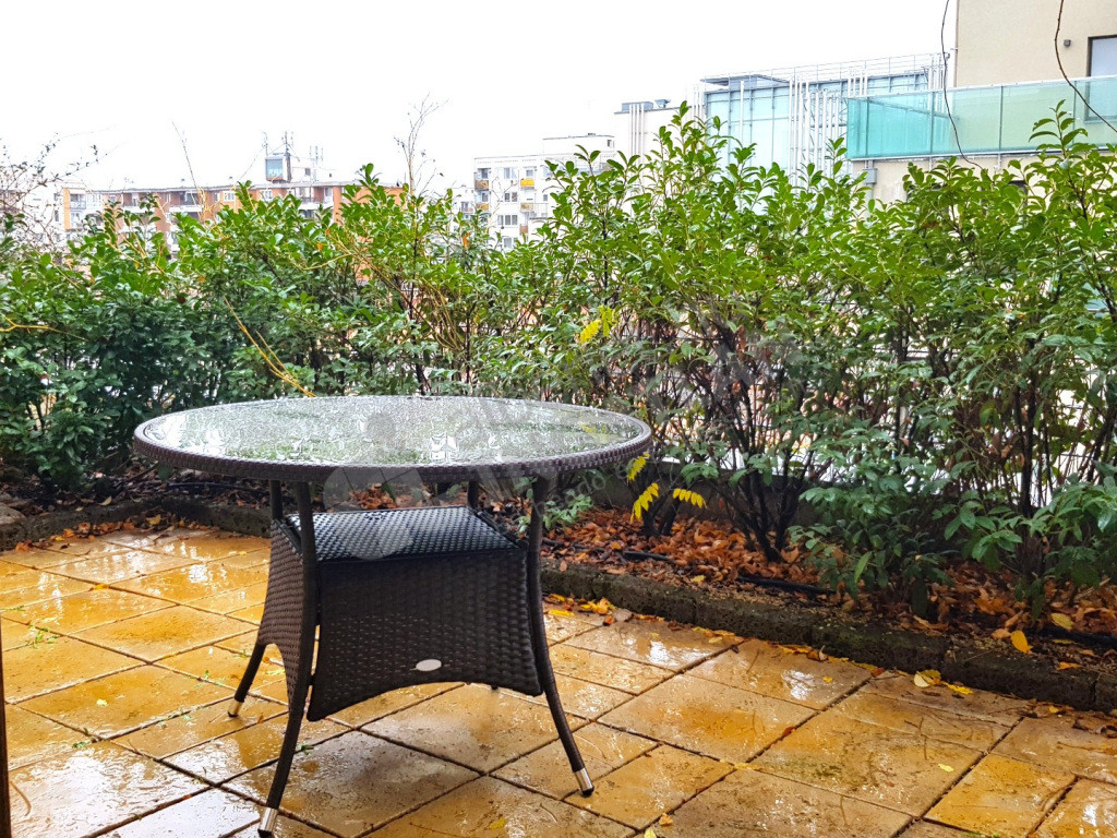 A nappaliból és a hálószobából lehet kijutni a nagy teraszra mely zöld növényekkel körbeültetett.