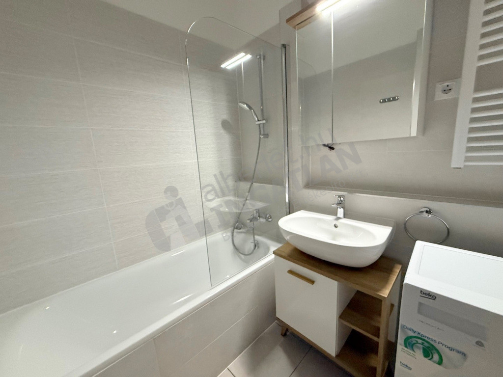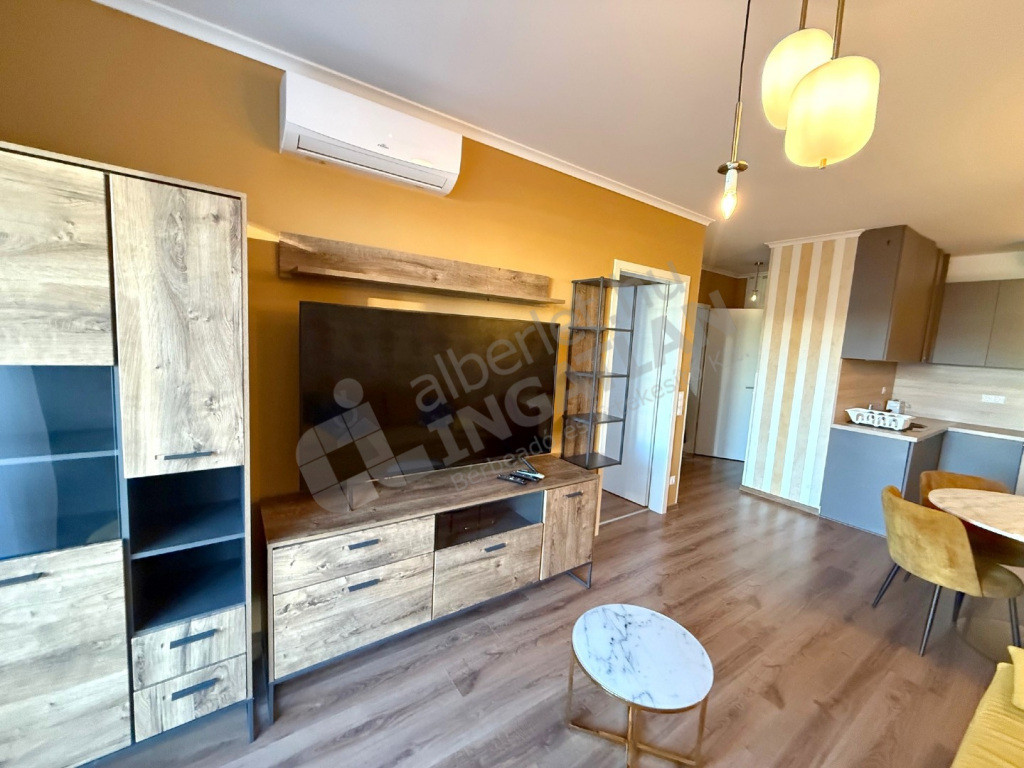 A lakás teljesen felszerelt és azonnal költözhető: mosógép, klímaberendezés, mosogatógép, valamint minden szükséges bútor és gép a rendelkezésre áll a kényelmes mindennapokhoz. A modern designer berendezés letisztult, mégis otthonos hangulatot teremt.