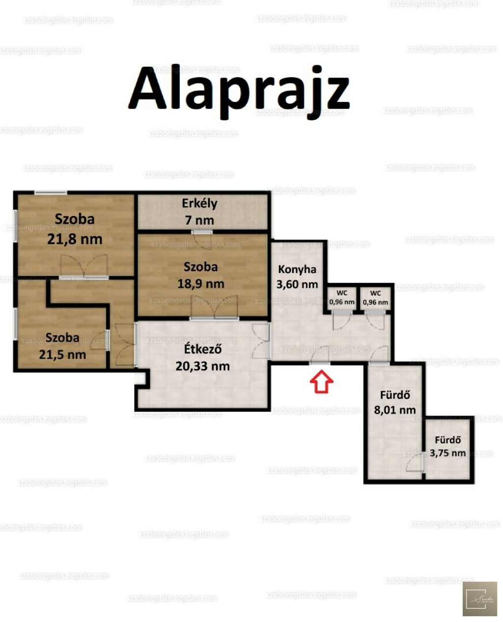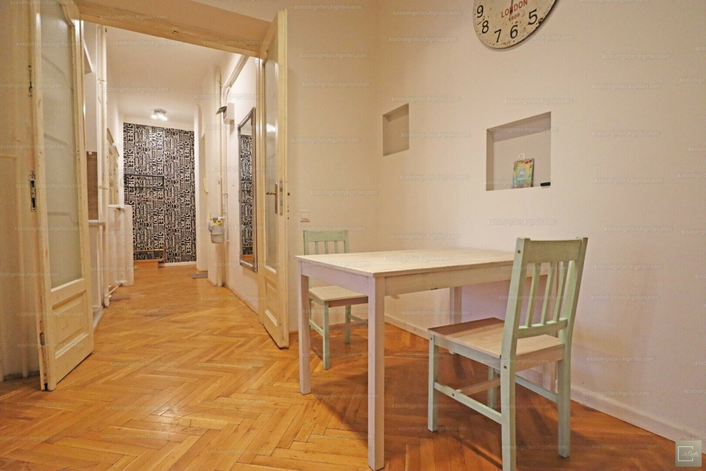A 102 négyzetméteres ingatlan 3 külön nyíló szobát, egy külön konyhát, 2 WC-t és fürdőszobát foglal magába. A szobák nagyok, mindegyik több mint 20 négyzetméteres.
