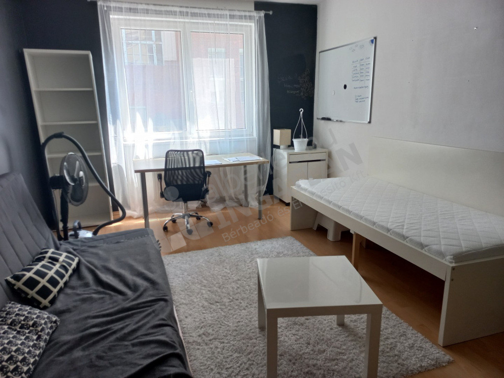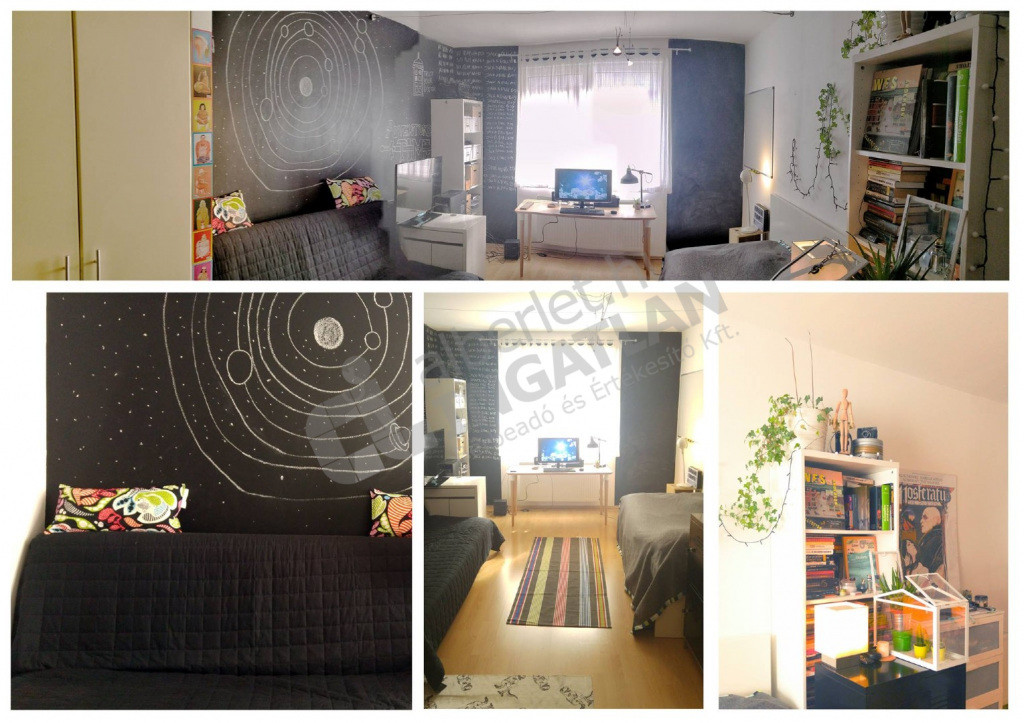 A szoba középső részében található egy óriási, beépített gardróbszekrény, egy kihúzható kanapé és egy egyszemélyes ágy, valamint könyvespolcok, ruhásszekrény, íróasztal, irodai forgószék és egy gurulós TV állvány. A szoba különlegessége, hogy az egyik oldalon krétával írható, mosható fekete falak vannak, a másik felén pedig egy nagyméretű whiteborad tábla, így ezek egyedi dekorációra, de tanulási segédeszközként is használhatóak. :)
