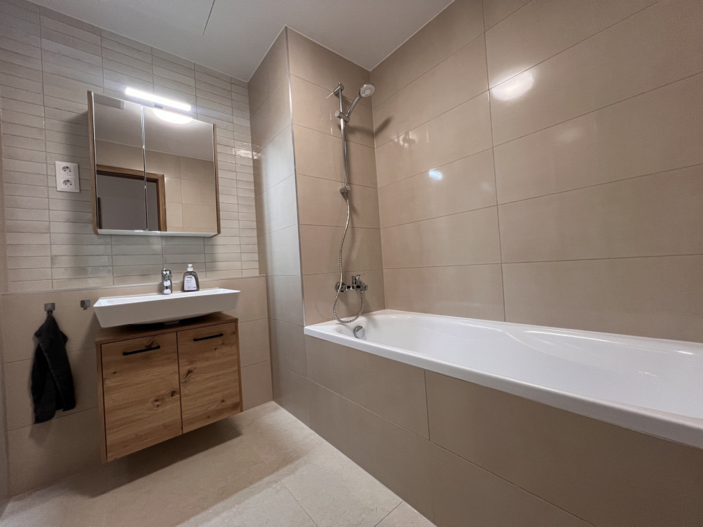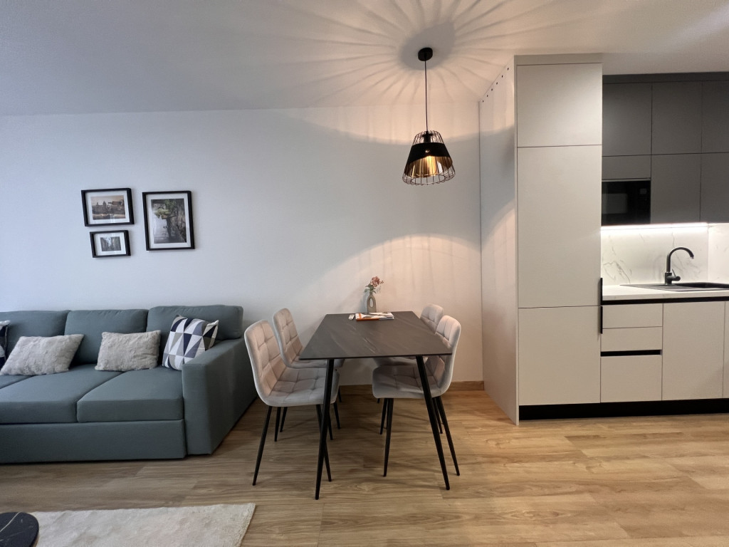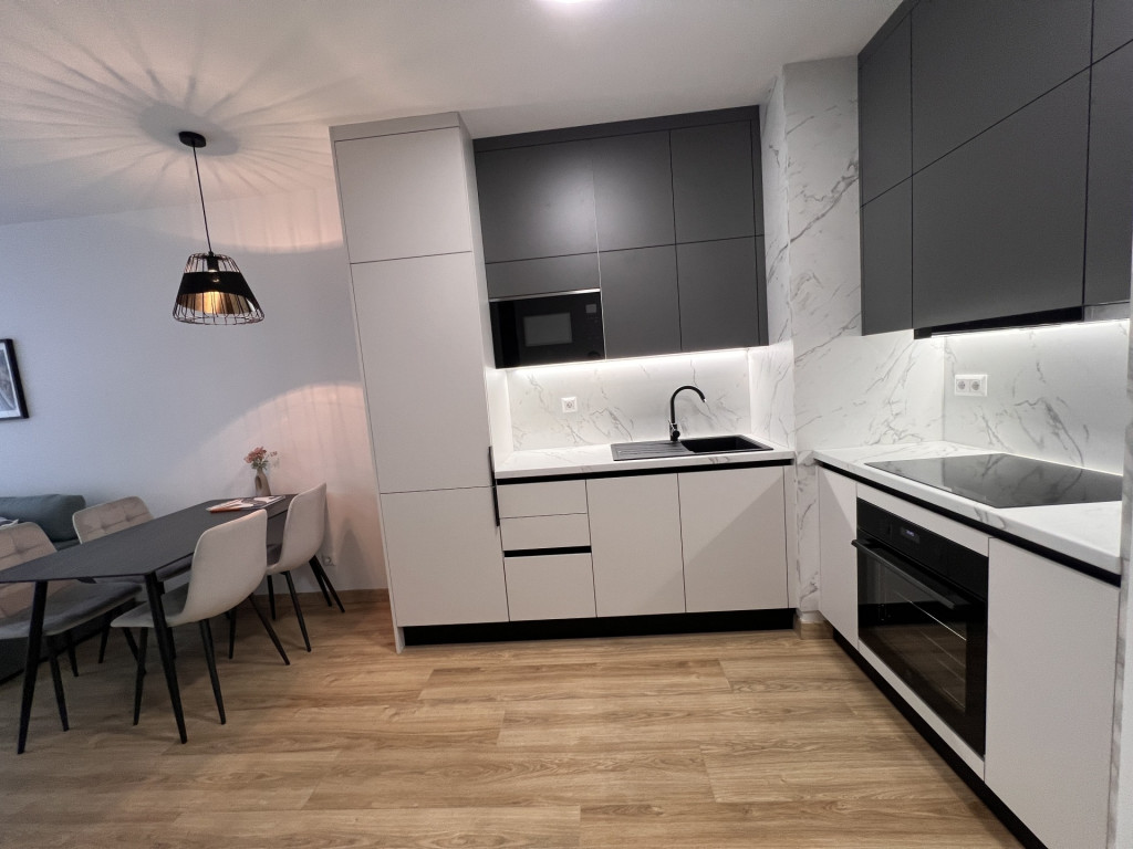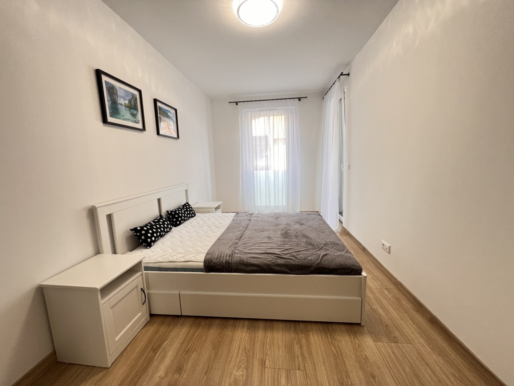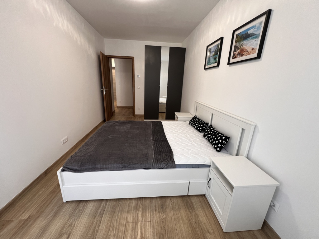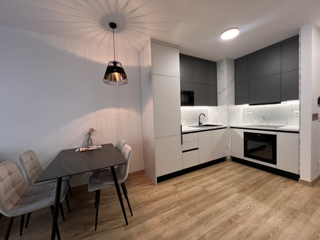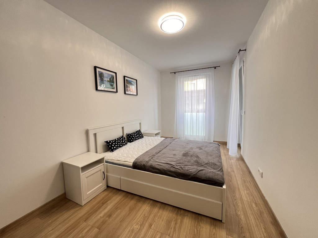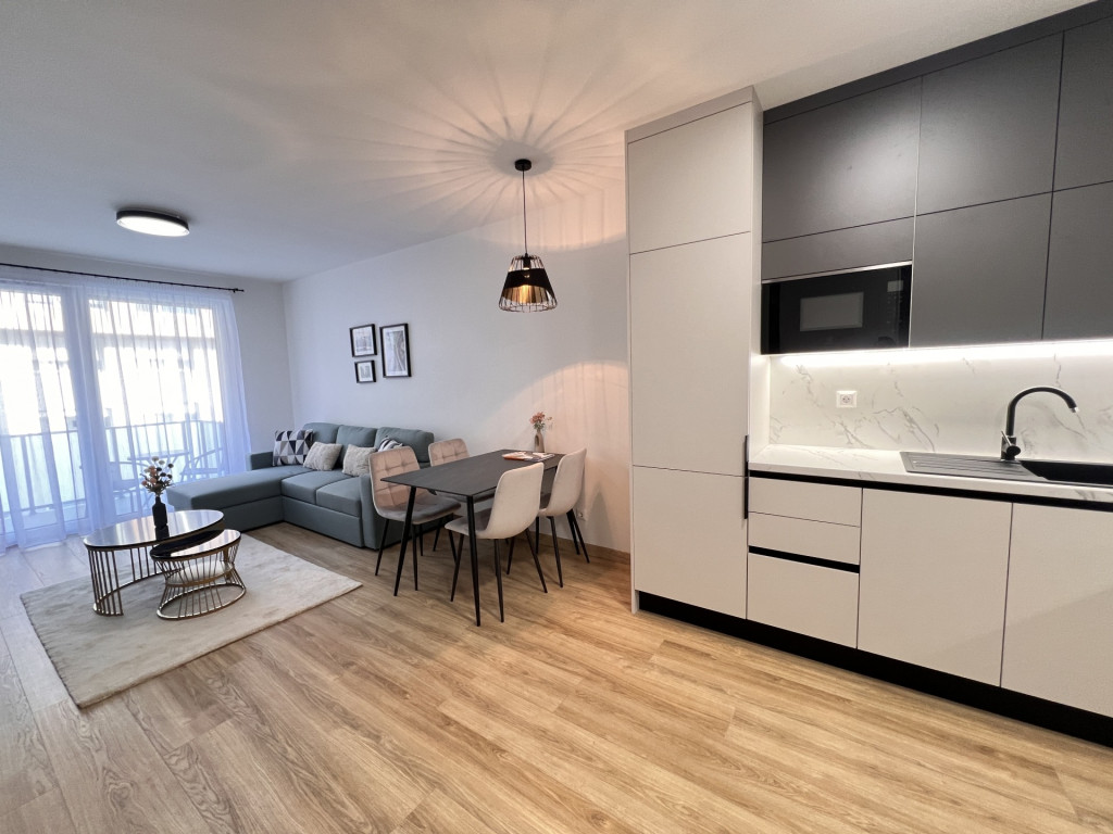 The apartment is completely new, furnished with high-quality furniture, fully equipped, and features a ceiling heating and cooling system.