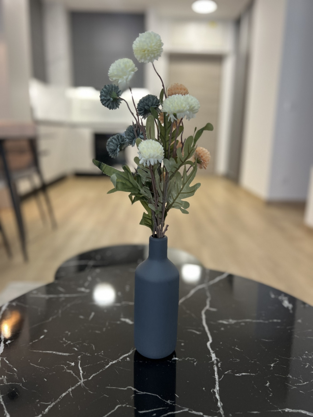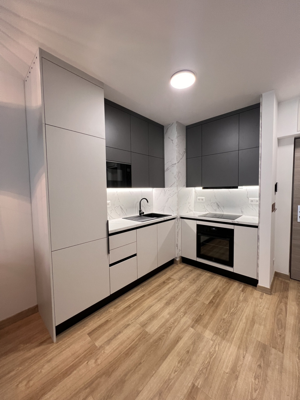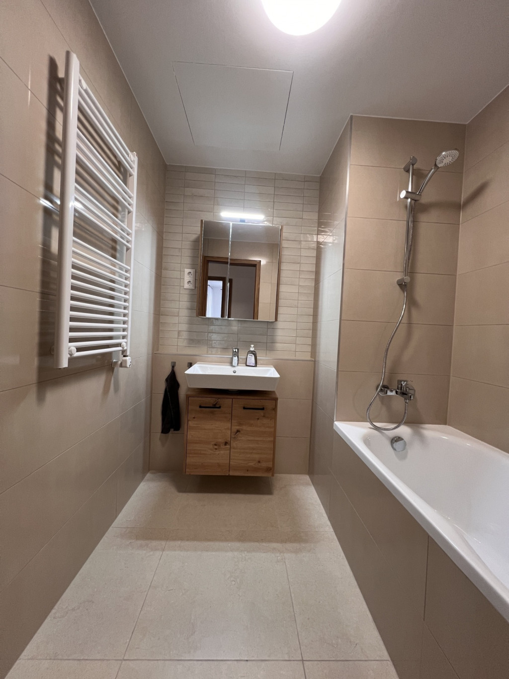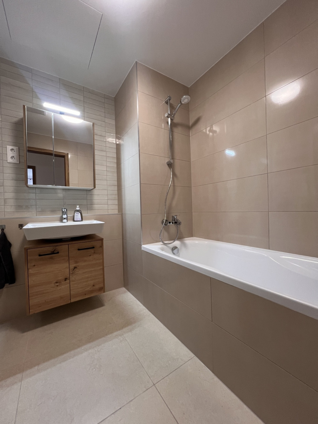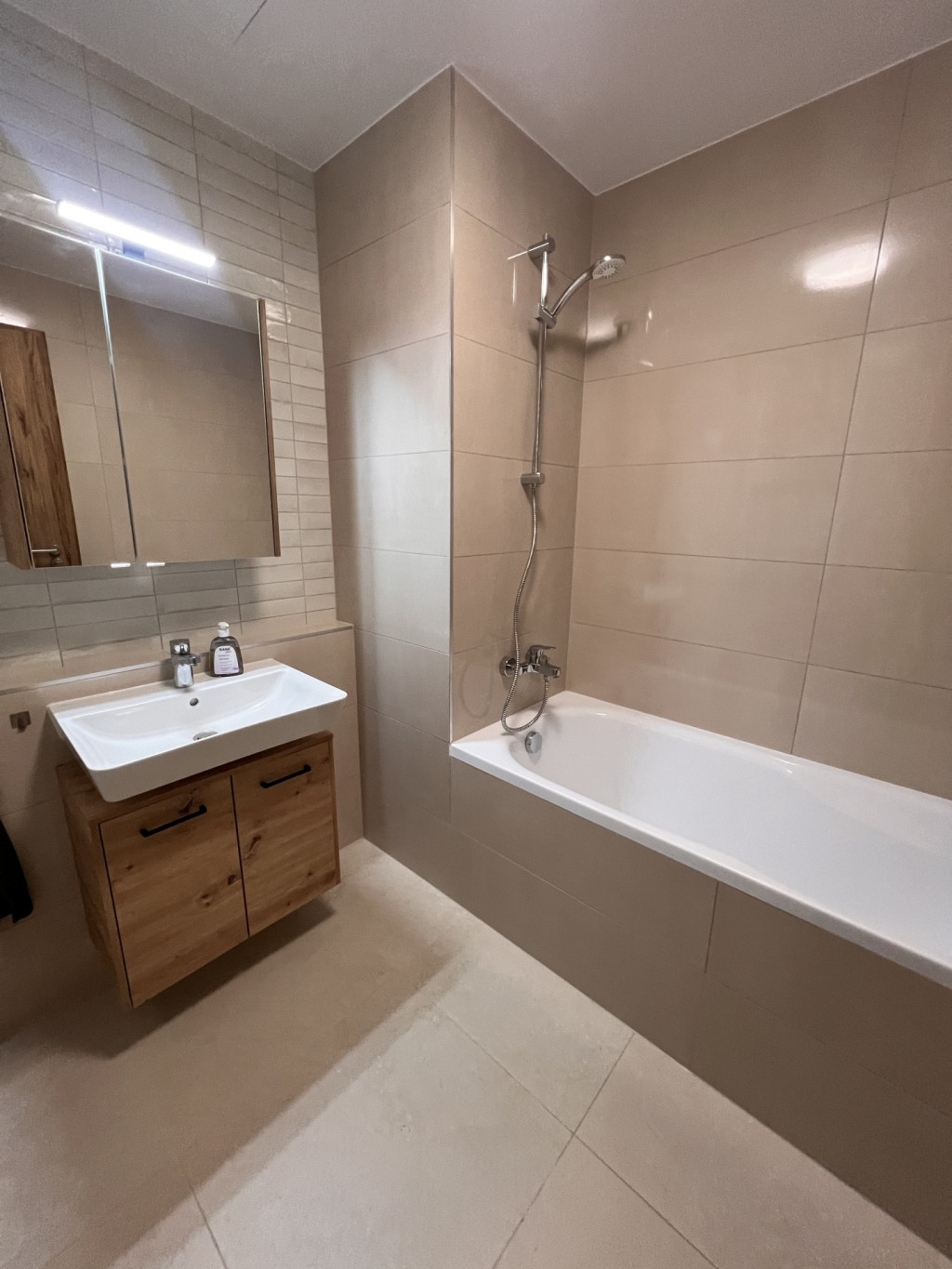 The apartment is completely new, furnished with high-quality furniture, fully equipped, and features a ceiling heating and cooling system.