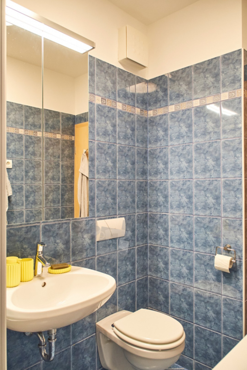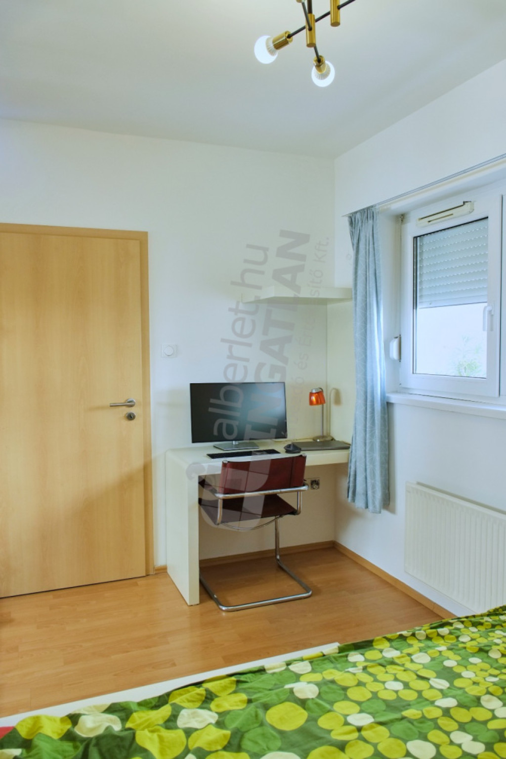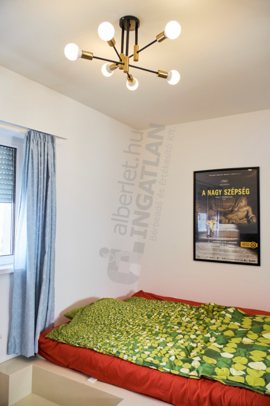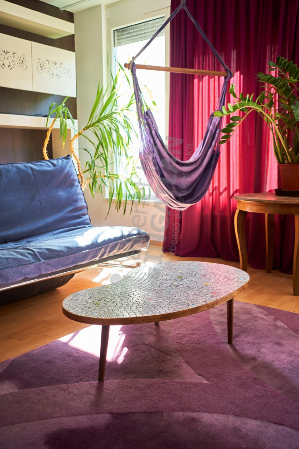 A lakás nagyon világos, francia ágy, hatalmas gardróbszekrény, függőszék lóg a mennyezetről, kanapé.