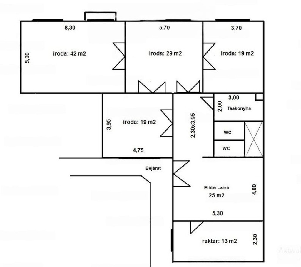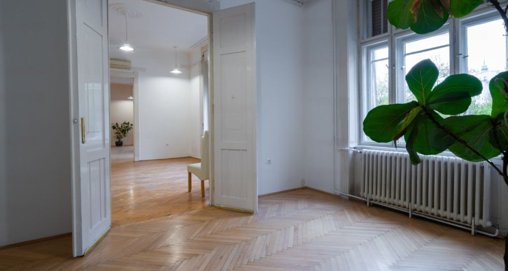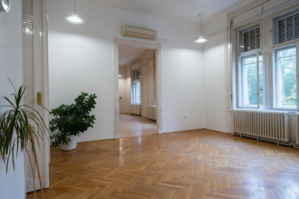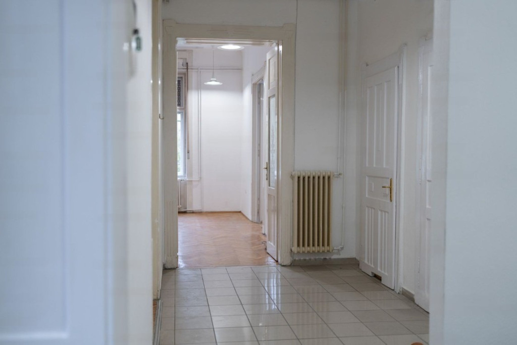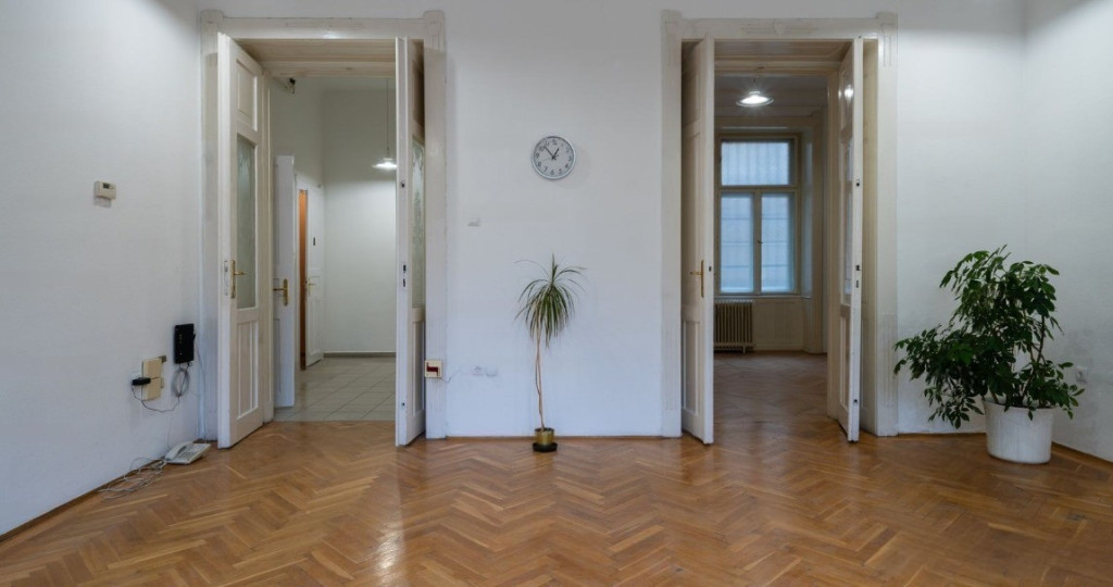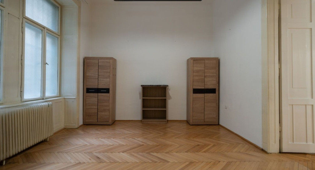 A lakásban az eredeti funkciója miatt fürdőszoba nem lett kiépítve, 2 WC-vel, teakonyhával rendelkezik, emellett 5 szoba - 2 KLÍMÁVAL felszerelt, 3 utcai nézetű, 2 udvar - található benne, illetve egy kisebb erkély is tartozik hozzá.