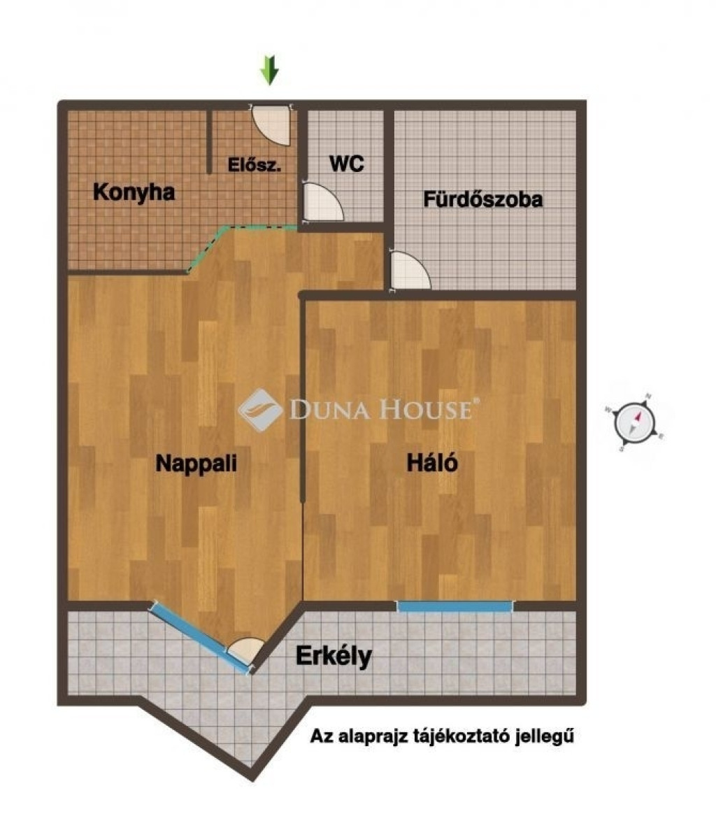 A lakás praktikus elosztású: nappali, külön hálószoba, kompakt, de jól felszerelt konyha, valamint kádas fürdőszoba mosógéppel. A hálószobában nagyméretű, faltól falig beépített szekrény biztosít bőséges tárolóhelyet. A lakás klimatizált, így minden évszakban kényelmes.