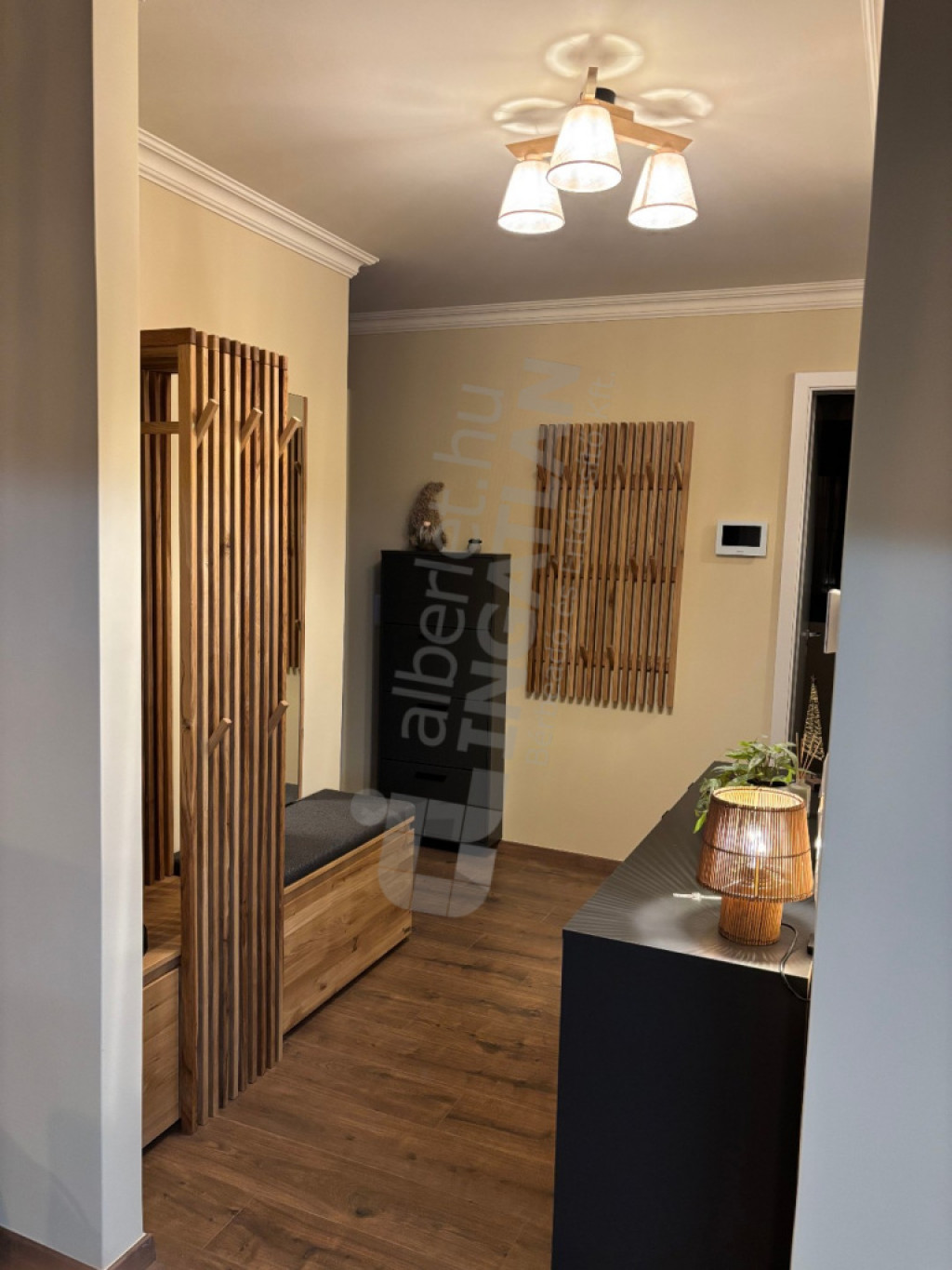 Elosztás: 7m2 előszoba, 31m2-es amerikai konyhás nappali, 12m2-es terasz, két teljes értékű, 11m2-es hálószoba + gardróbszoba, 7m2-es, dupla mosdós, kádas fürdőszoba, külön WC, 15m2-es szülői háló, melyhez 6m2-es gardrób, és egy másik fürdőszoba is tartozik.