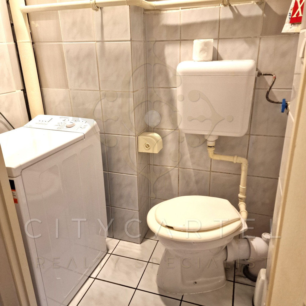 Tovább haladva az előszobában találjuk a toalettet, ahol a mosógépet is elhelyezték.