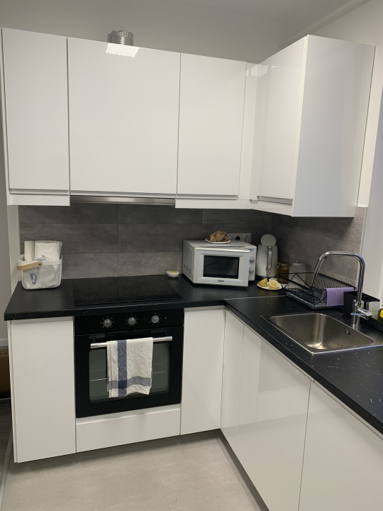 A lakás bútorozatlan, így teljesen a saját ízlésed szerint rendezheted be, de vár benne két IKEA gardrób és két beépített szekrény, amik praktikus tárolási lehetőséget adnak. A modern konyha teljesen gépesített: hűtő fagyasztóval, elektromos sütő és főzőlap, valamint mosogatógép áll rendelkezésedre.