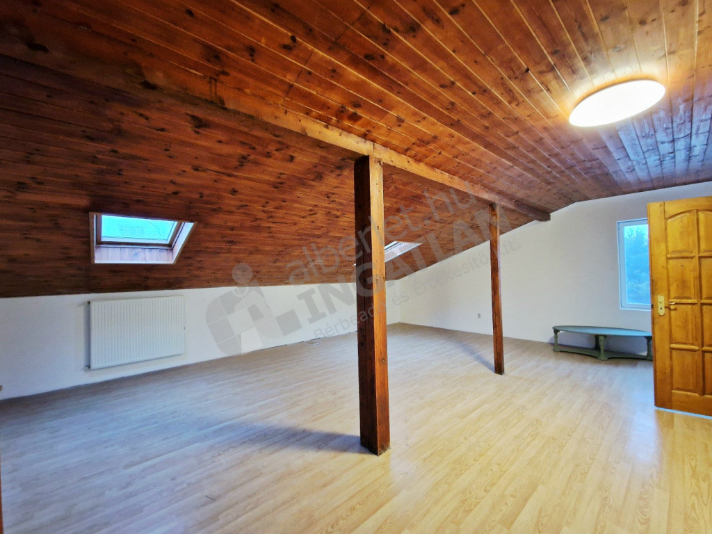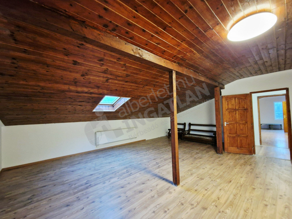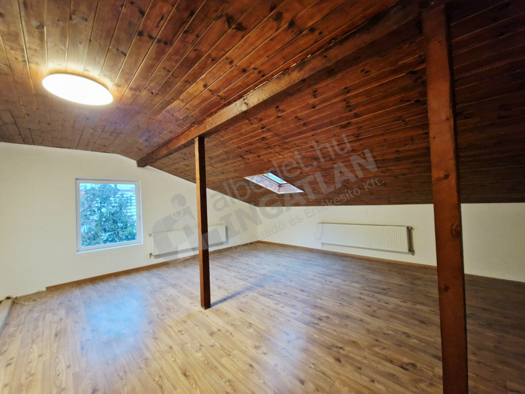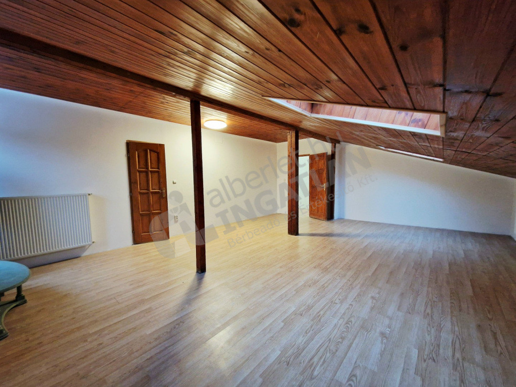 A lakás egy családi ház legfelső szintjén, leválasztva található. Kertből nyíló lépcsőn közelíthető meg.