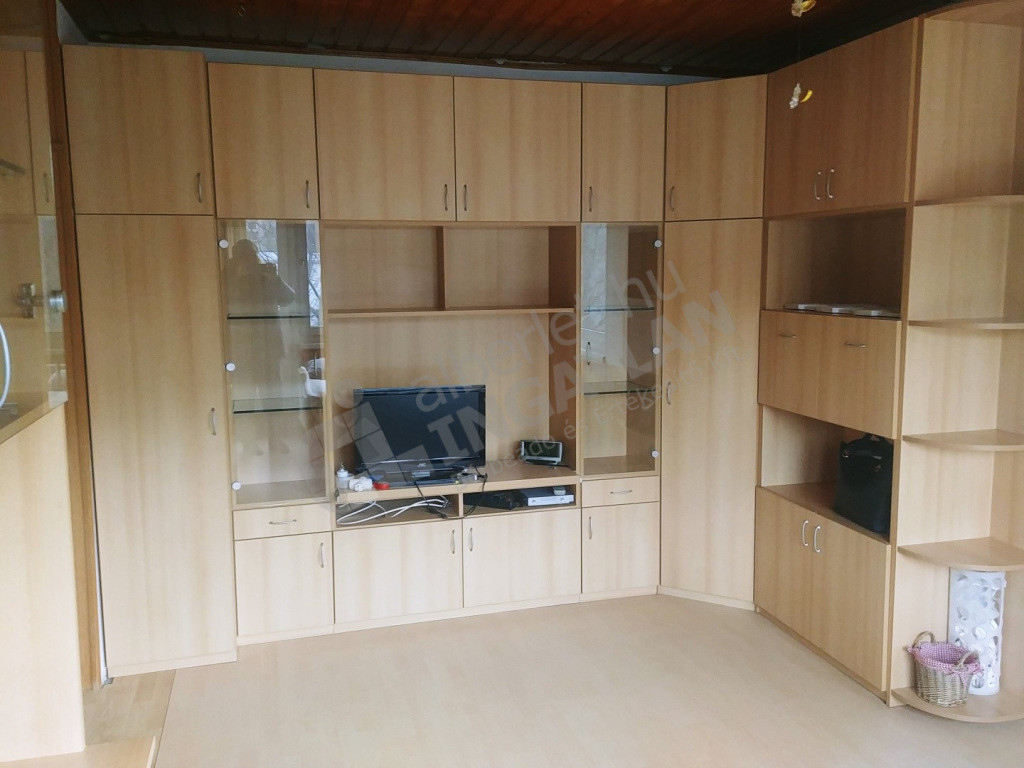 A világos konyhában, konyhabútor, elektromos tűzhely, hűtő és mosogatógép kapott helyet. a nappaliban beépítettszekrény és tálalószekrény is van, a hálószobában polc található.