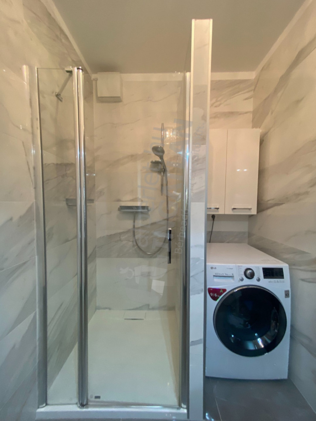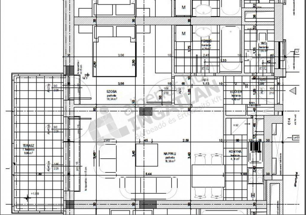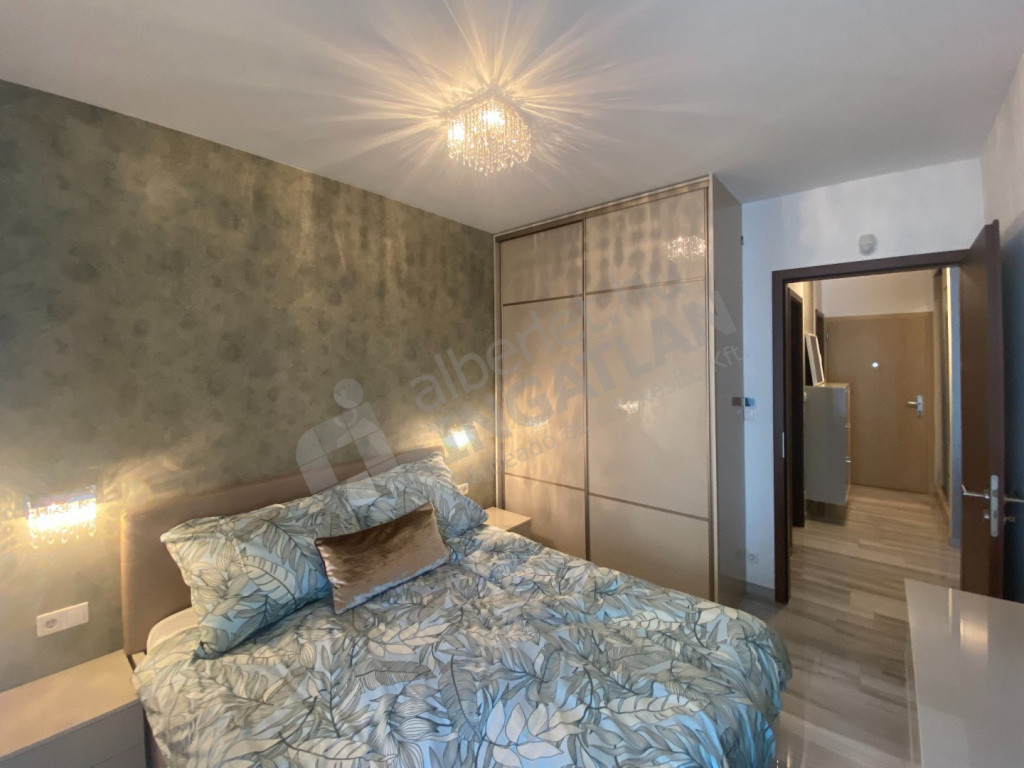 45 négyzetméteres, amerikai-konyhás, hálószobás (gardrób szekrényes), nagy fedett teraszos, (9 m2). A fürdőszobában épített zuhany, a WC külön helyiségben van.