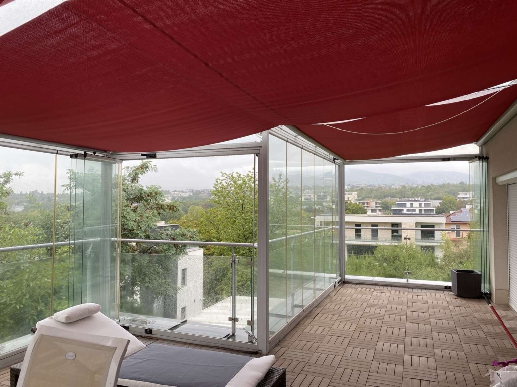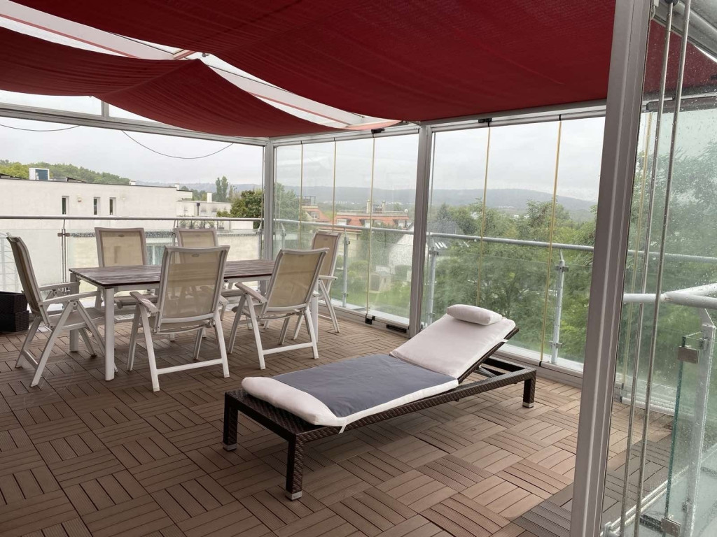 Az 50 nm-es terasz elhúzható üveg elemekkel és motoros árnyékolókkal is felszerelt, így télen-nyáron jól kihasználható.