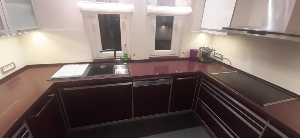 A konyha a nappaliból üvegajtóval leválasztva nyílik, minden beépített gép magas minőségű, elektromosan nyíló fiókokkal felszerelt.