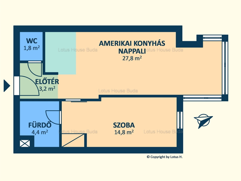 A lakás alapterülete 52nm. A nappali a konyharésszel 27,8nm, a szoba 14,8nm nagyságú.