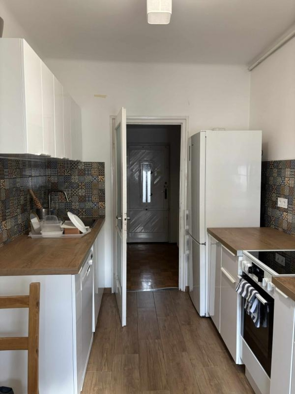 A lakás ablakai bár a forgalmas utcára néznek, mégis csendes és világos.