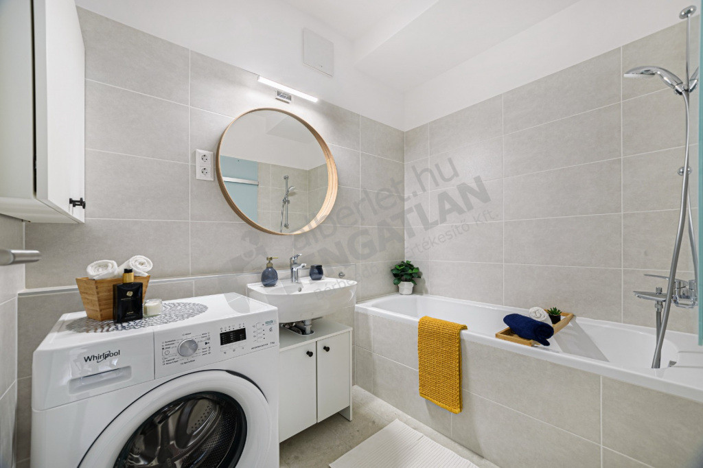 Kádas fürdőszoba, új mosógéppel és praktikus szekrényekkel
