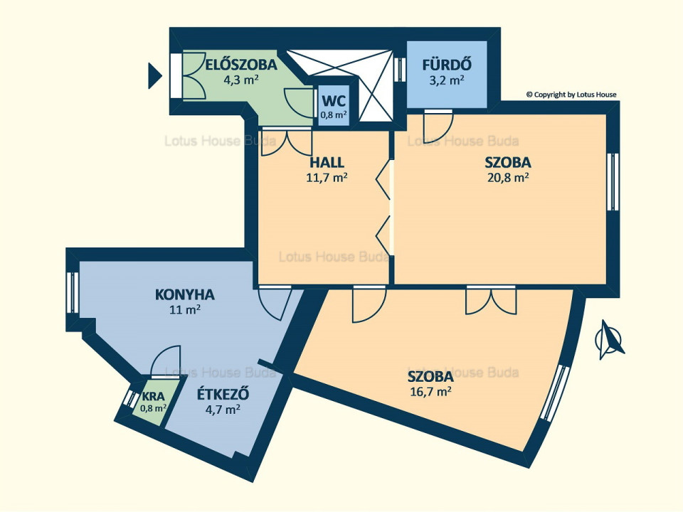 A lakás alapterülete 74nm. A szobák 20,8nm és 16,7nm, a hall 11,7nm, az étkezős konyha 15,7nm nagyságú.