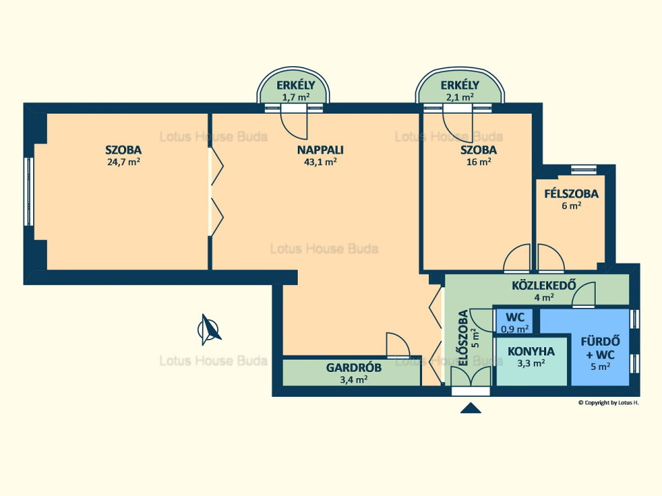 A lakás alapterülete 107nm, amit az összesen 4nm nagyságú két erkély nagyobbít. A nappali 43,1nm, míg a szobák 24,7nm és 6nm, míg a kisszoba 6nm nagyságú.